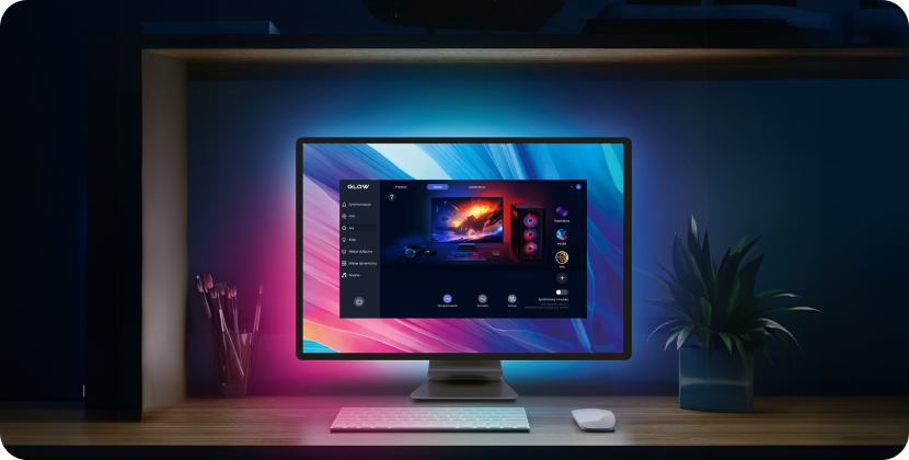 Das Gerät kann über eine mobile Smartphone-App gesteuert werden. Dedizierte glow-Anwendung ermöglicht es Ihnen, die Beleuchtung des Monitors nach Ihren individuellen Wünschen einzustellen. Die wichtigste Funktion ist automatische Farbsynchronisation. In diesem Modus passt Glow die Farbe des Lichts automatisch an den auf dem Bildschirm angezeigten Inhalt an. Außerdem können wir einen von drei Lichtmodi auswählen: Filmmodus, Spielmodus oder universeller Weißmodus. Ein Fußballspiel oder eine Filmpremiere zu sehen, wird zu einem noch interessanteren Erlebnis.