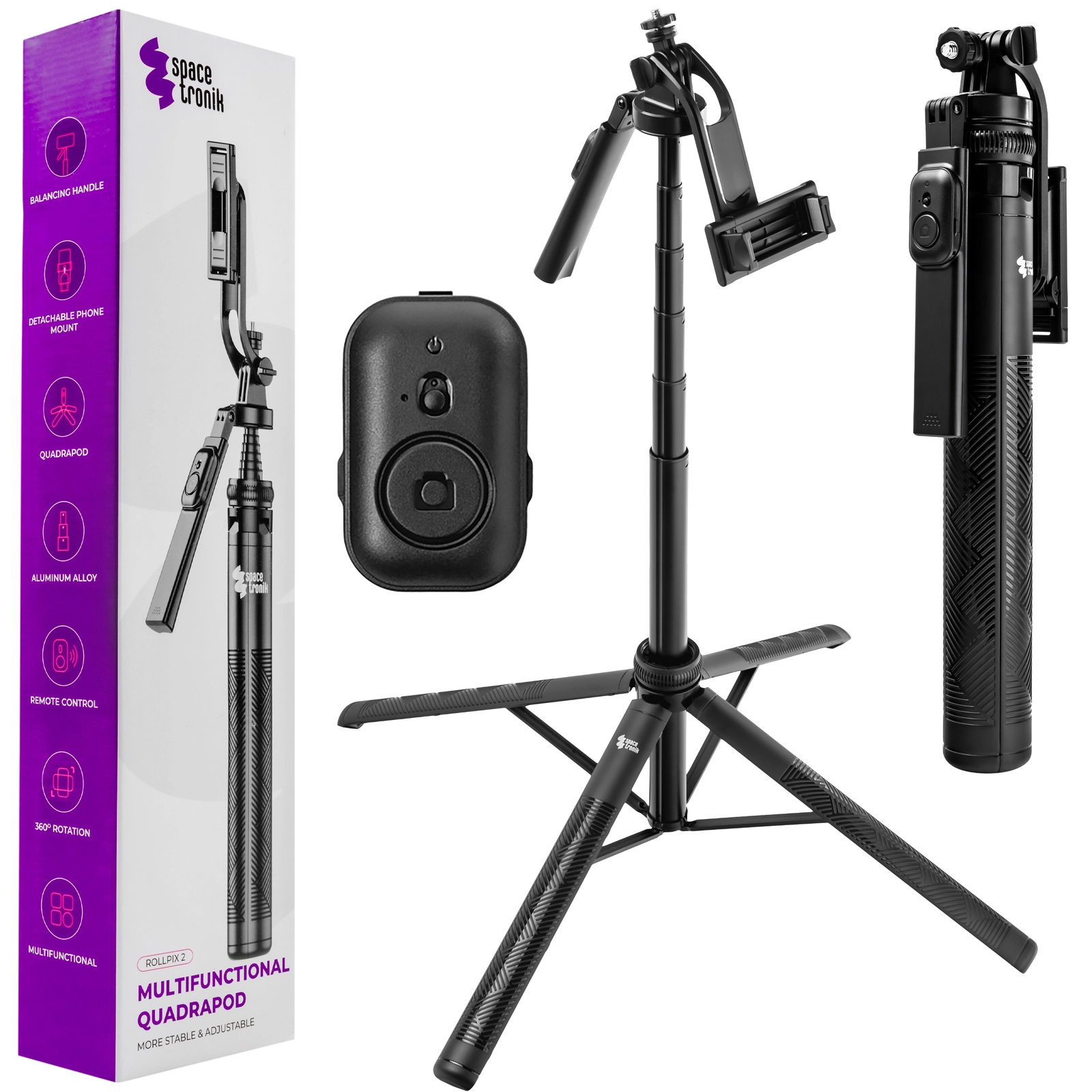 Der Spacetronik RollPix Pro SR-ROLLPIX02 ist die perfekte Lösung für Fotoenthusiasten und Content Creator! Die stabile Konstruktion des Vierbein-Stativs, die Höhenverstellung bis zu 1800 mm und der Universalgriff machen jedes Foto und Video perfekt. Das leichte, faltbare Design erleichtert den Transport und die Bluetooth-Fernbedienung ermöglicht eine bequeme Fernsteuerung. Der RollPix Pro ist ein vielseitiges Gerät, das als Stativ, Selfie-Stick und Beleuchtungswerkzeug fungiert und sich an Ihre Bedürfnisse anpasst. Perfekt für Reisen, Außenaufnahmen und Fotoshootings. Lassen Sie jeden Moment zu einer unvergesslichen Geschichte werden mit dem RollPix Pro!