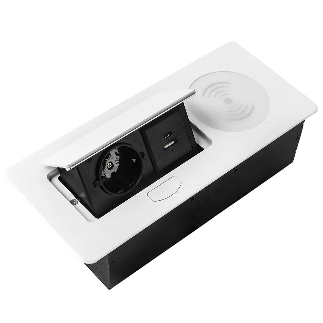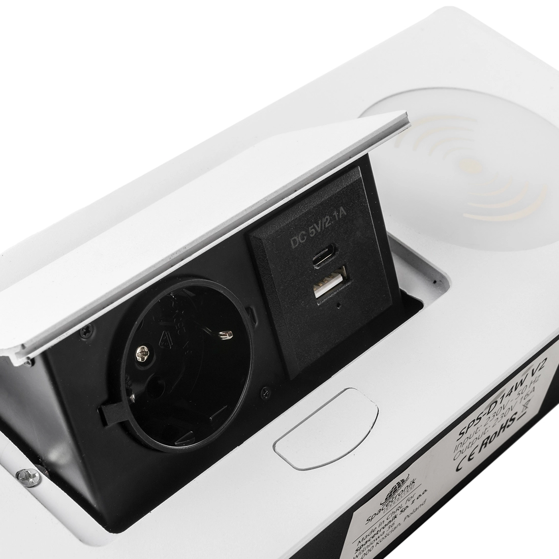 Die Spacetronik ERGOLINE SPS-D14W V2 Thekensteckdose ist eine moderne Lösung, die in Geschäften, Ausstellungsräumen, Konferenzräumen, Büros und auch zu Hause eingesetzt wird. Ein Knopfdruck und die Steckdosen öffnen sich sanft. Sie ist aus Aluminium und hochwertigen Komponenten gefertigt. Das Produkt ist für die Innenmontage in Schreibtischen, Arbeitsplatten und Tischen konzipiert, sowohl vertikal als auch horizontal, um den Zugang zu Steckdosen zu ermöglichen. Der Mediaport ist mit 1 110-250-V-Steckdose (deutscher Typ (Schuko)), einem USB-C + USB-A-Ladegerät und einem induktiven Ladegerät ausgestattet.