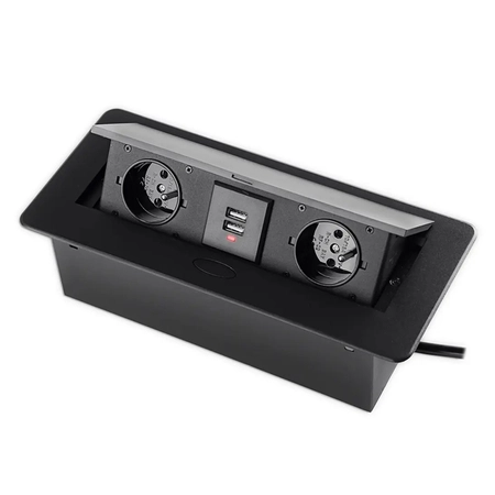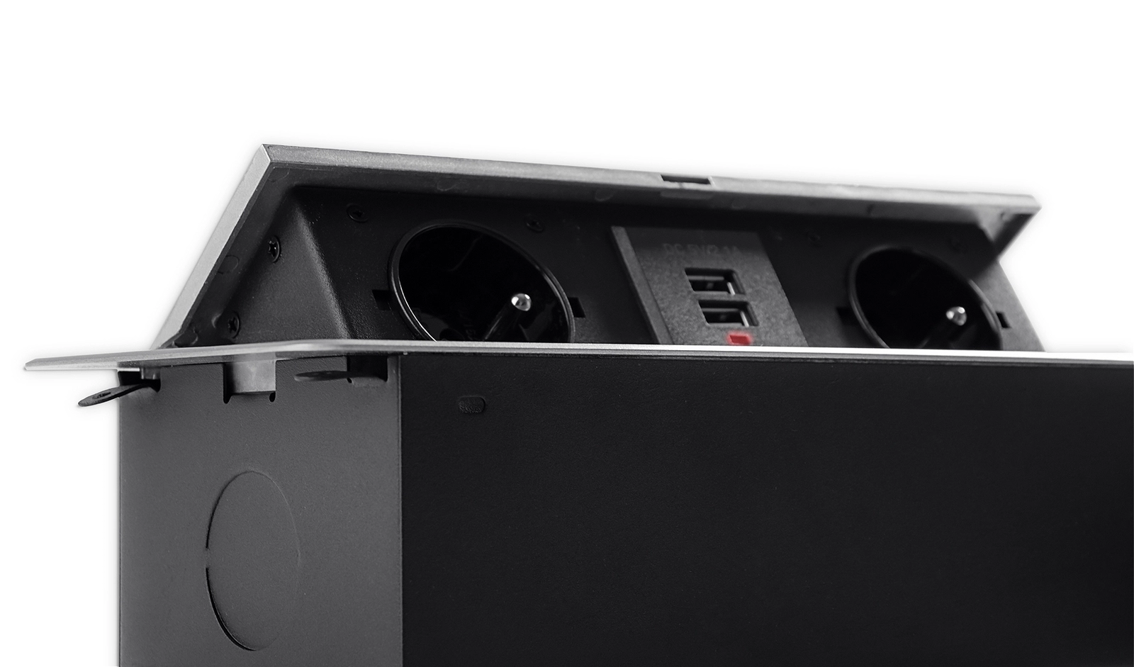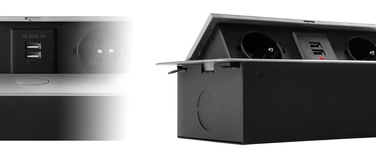 Der Spacetronik mediaport ERGOLINE SPS-D24B ist eine moderne Lösung, die in Geschäften, Ausstellungsräumen, Konferenzräumen, Büros und auch zu Hause eingesetzt wird. Ein Knopfdruck und die Steckdosen öffnen sich sanft. Sie ist aus Aluminium und hochwertigen Komponenten gefertigt. Das Produkt ist für die Innenmontage in Schreibtischen, Arbeitsplatten und Tischen konzipiert, sowohl vertikal als auch horizontal, und bietet Zugang zu Steckdosen. Der Mediaport ist mit 2 Steckdosen 110-250 V (französischer Typ) und einem doppelten USB-Ladegerät ausgestattet.