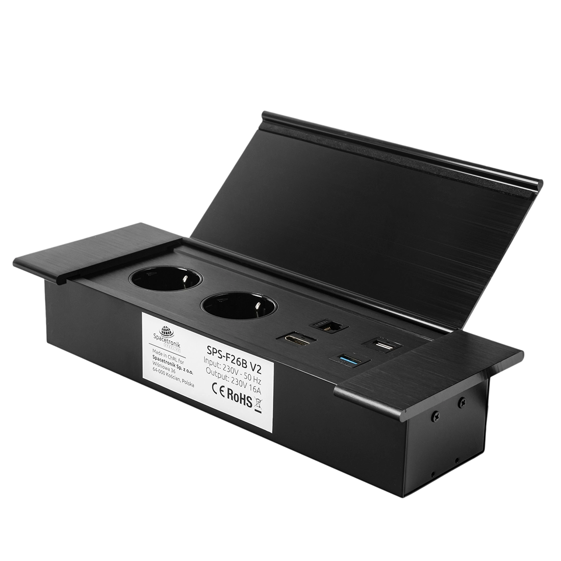 Der Spacetronik Spacetronik SPS-F26B V2 mediaport ist eine hochmoderne Lösung, die in Geschäften, Ausstellungsräumen, Konferenzräumen, Büros und auch zu Hause eingesetzt wird. Heben Sie die Klappe an, um Zugang zu einer Reihe von Steckdosen zu erhalten. Er ist aus Aluminium und hochwertigen Komponenten gefertigt. Das Produkt ist für die Innenmontage in Schreibtischen, Arbeitsplatten und Tischen konzipiert, entweder vertikal oder horizontal, und bietet Zugang zu Steckdosen. Der Mediaport ist mit 2 Steckdosen 110-250 V (Typ Schuko), einem HDMI-Anschluss, einer RJ-45-Ethernet-Buchse der Kategorie 6 und zwei USB-Anschlüssen (2.0 und 3.0) ausgestattet.