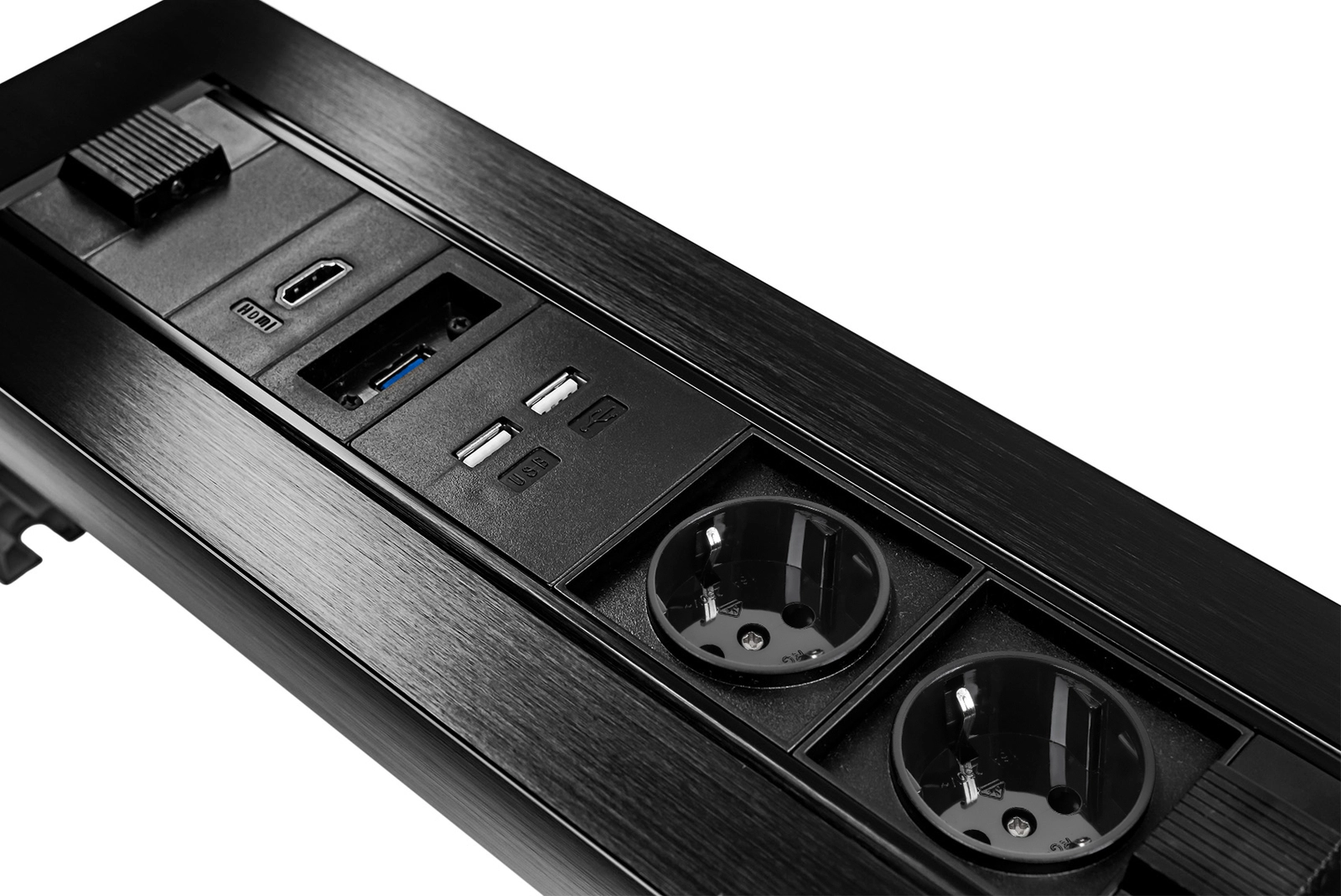 Der elektrische Mediaport SPS-E27B V2 von Spacetronik ist eine hochmoderne Lösung, die in Geschäften, Ausstellungsräumen, Konferenzräumen, Büros und auch zu Hause eingesetzt wird. Mit einem einzigen Knopfdruck decken sich die Steckdosen nahtlos auf. Er ist aus Aluminium und hochwertigen Komponenten gefertigt. Das Produkt ist für die Innenmontage in Schreibtischen, Arbeitsplatten und Tischen konzipiert, entweder vertikal oder horizontal, und bietet Zugang zu Steckdosen. Der Mediaport ist mit 2 Steckdosen 110-250 V (Typ Schuko), einem dualen USB-Ladegerät, HDMI 2.0, USB 3.0 und einem induktiven Ladegerät zum kabellosen Aufladen Ihres mobilen Geräts ausgestattet.