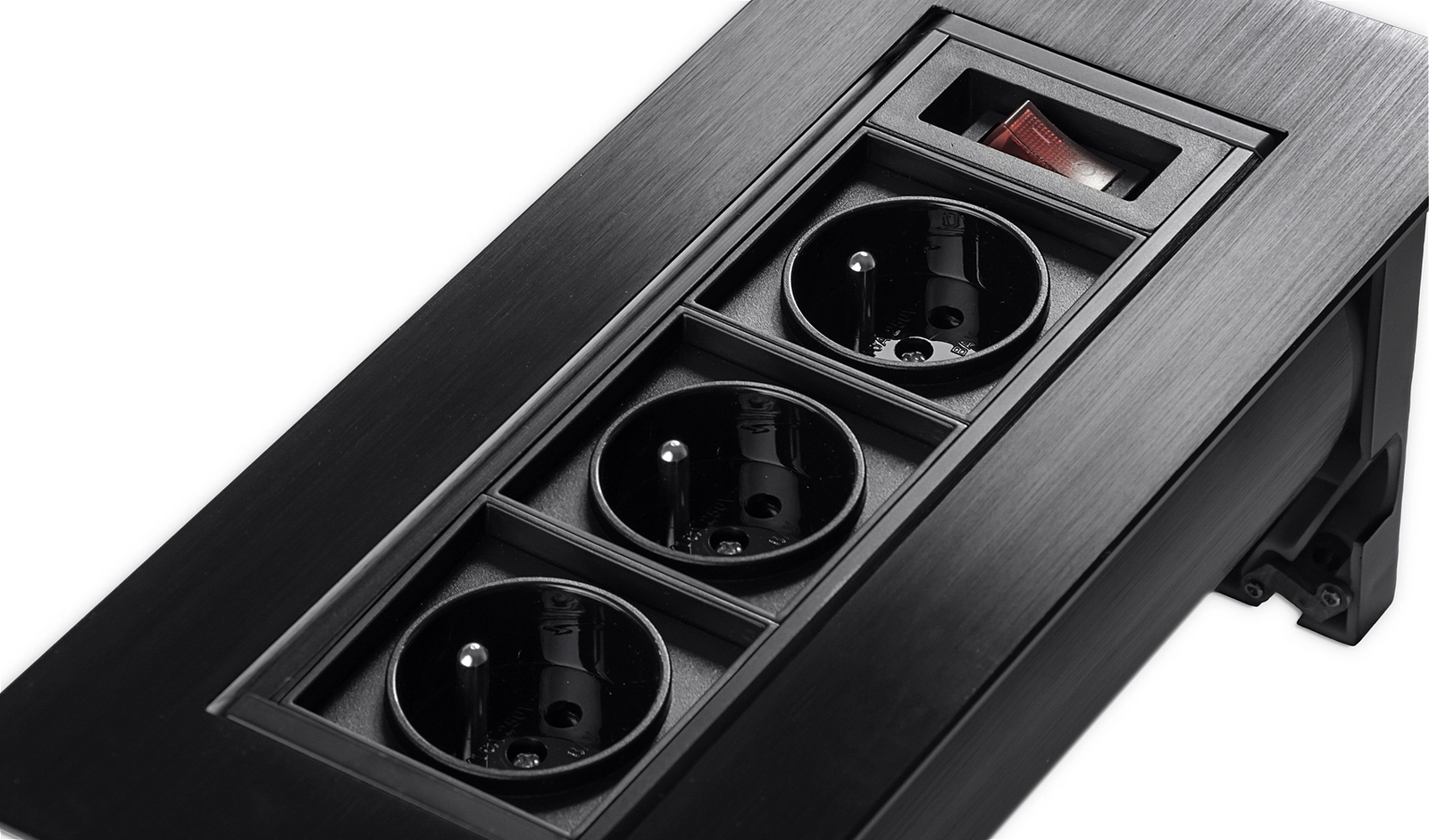 • Elegantes, auf der Arbeitsplatte montiertes, drehbares Mediaport. Mit 3 Steckdosen und einem Netzschalter. Kabellänge 1,5 m. In Schwarz