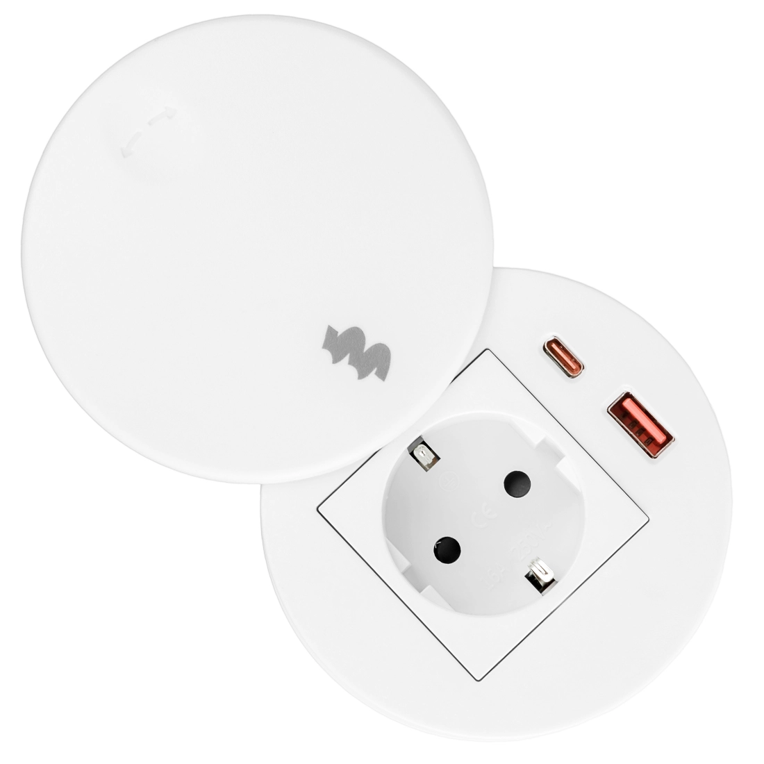 • Elegante runde Möbelsteckdose. Sie verfügt über 1 Steckdose (Schuko) und ein USB-A + USB-C Ladegerät, um zumindest Ihr Smartphone und andere Geräte aufzuladen. Kabellänge 1,5 m. In Weiß