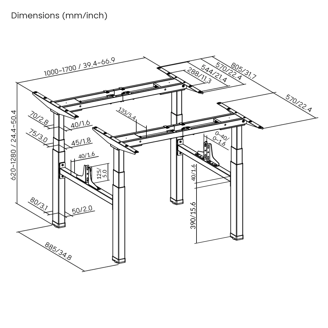 Abmessungen: 1000~1700 x 1375 x 620~1280 mm (39.4"~66.9 "x 54.1 "x 24.4"~50.4")