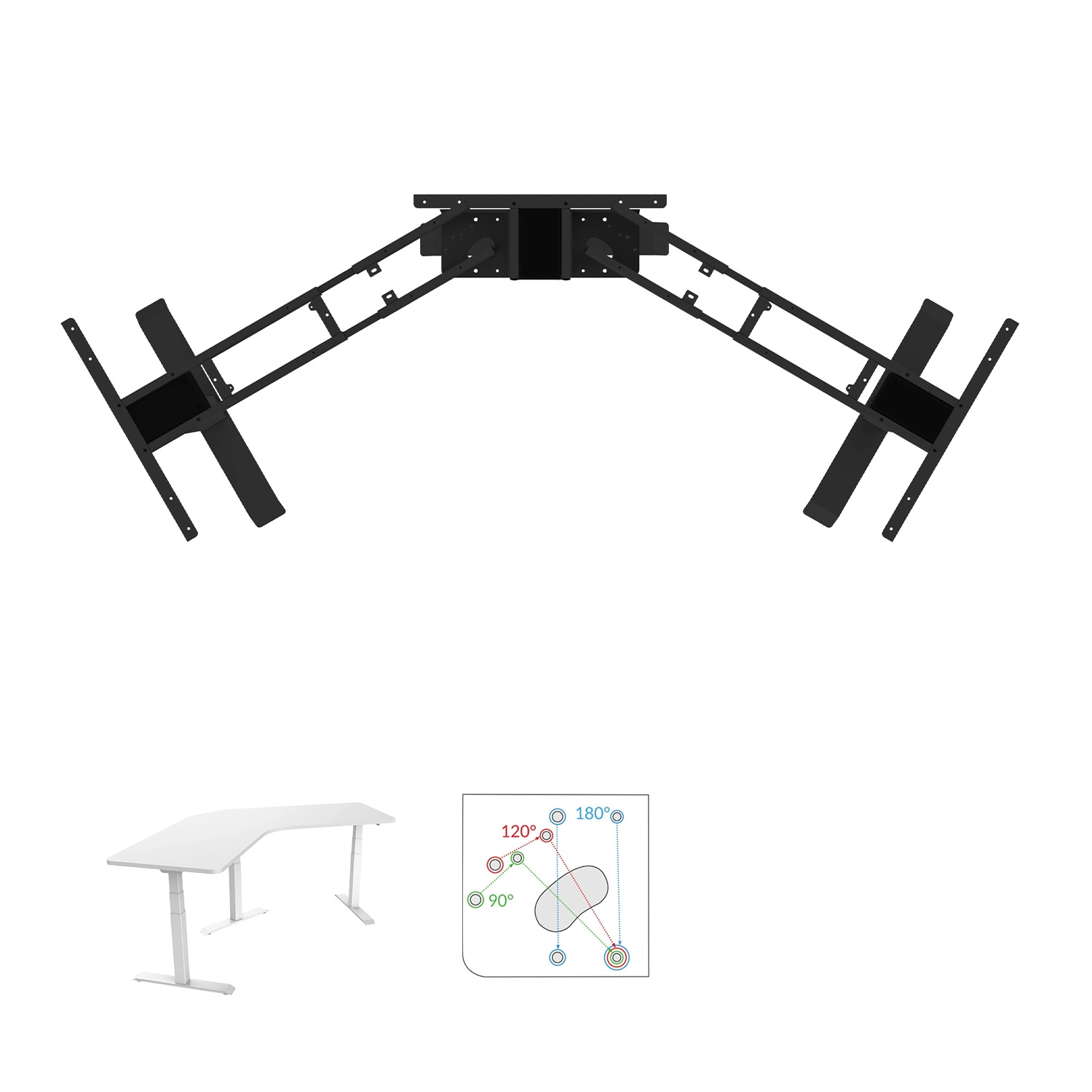 Das vielseitige Gestell des elektrischen Gestells ermöglicht nicht nur die Verstellung nach oben/unten und die Umstellung auf drei Varianten, sondern auch die doppelte manuelle horizontale (seitliche) Verstellung. Sie können die Struktur ganz einfach an die Größe Ihrer Tischplatte anpassen. Empfohlene Abmessungen der Tischplatte: für 90° 1300 - 1900 mm (2 Seiten), 600 - 800 mm; für 120° 1100 - 1800 mm, 600 - 800 mm; für 180° 1700 - 2900 mm, 600 - 1000 mm.