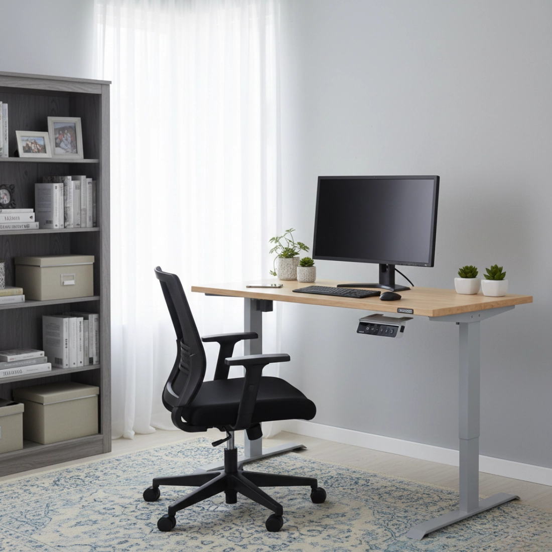 Mit den Auf- und Ab-Tasten können Sie ganz einfach die ideale Höhe einstellen. Mit vier programmierbaren Tasten können Sie Ihre Lieblingspositionen speichern und mit einem einzigen Klick zu jeder beliebigen Position zurückkehren, wenn Sie beispielsweise im Stehen arbeiten möchten. Die aktuelle Höhe des ergonomischen Schreibtisches wird auf dem Display angezeigt. Mit einer Tastenkombination können wir den Controller gegen ungewollte Benutzung, z.B. durch Kinder, sperren.
