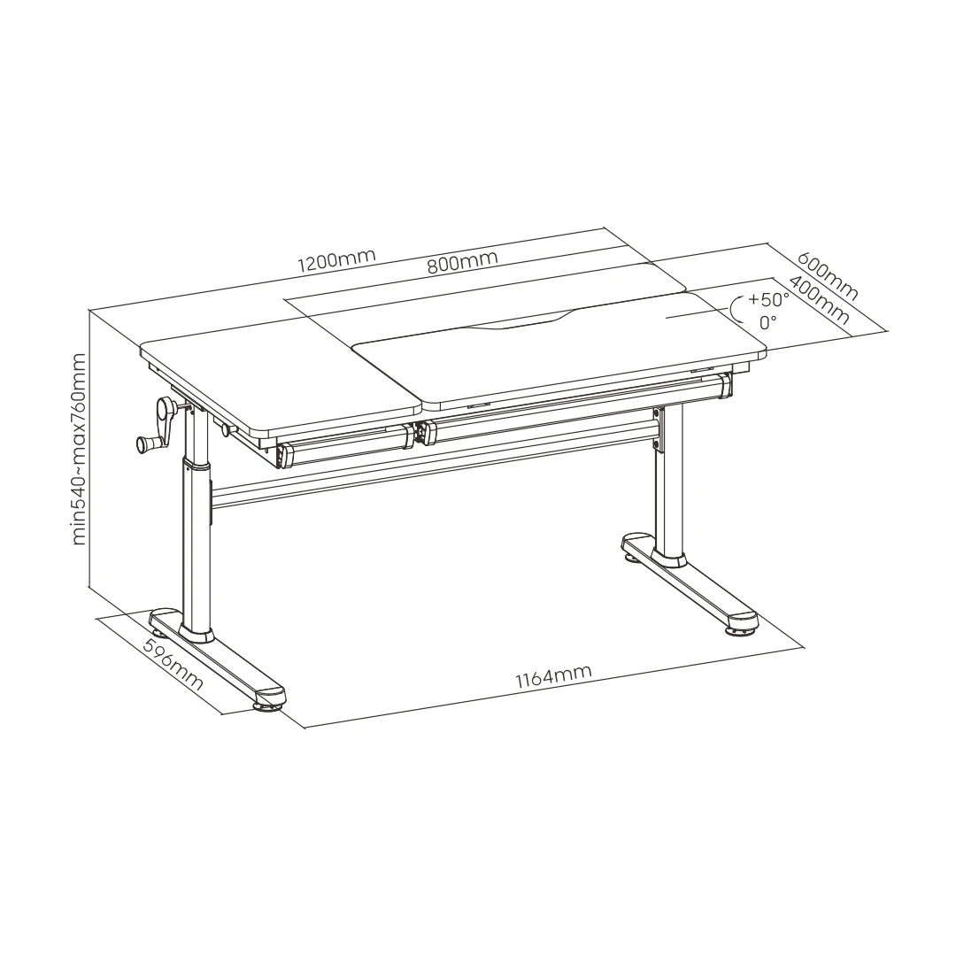 Die kippbare Tischplatte im Bereich von 0-50 Grad ermöglicht ergonomische Winkel zum Lesen, Schreiben und Zeichnen. Dank dieser Konstruktion ermöglicht der Tisch bequeme Arbeitspositionen und hilft, Nacken- und Rückenschmerzen zu vermeiden. Der verwendete pneumatische Hebelmechanismus ermöglicht eine einfache Einstellung - einfach den Auslöser drücken und die Platte in die gewünschte Position neigen, dann loslassen - die Platte rastet in der aktuellen Position ein. Die Größe der kippbaren Platte beträgt 80 x 40 cm.