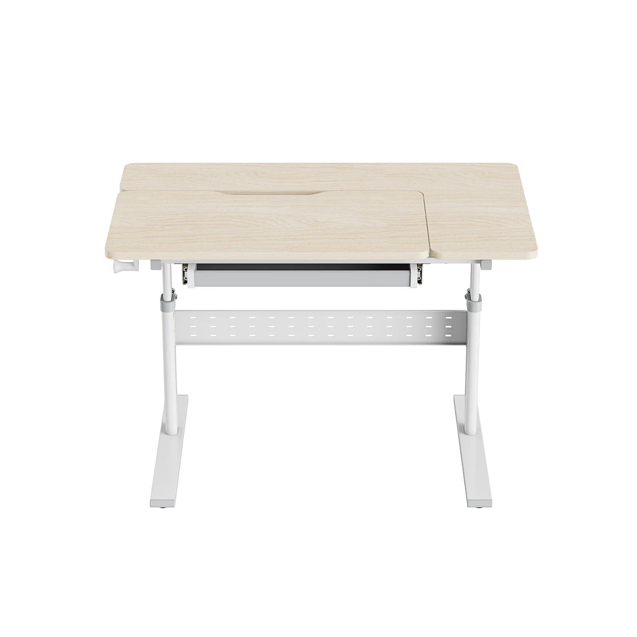 • Ein verstellbarer Kinderschreibtisch, der mit seinem Benutzer mitwächst. Stellen Sie die richtige Höhe der Tischplatte ein, um sie an die Körpergröße Ihres Kindes anzupassen, von 54 cm bis 76 cm. Tischplatte 100 x 60 cm. Weiße Farbe, holzfarbene Platte. H