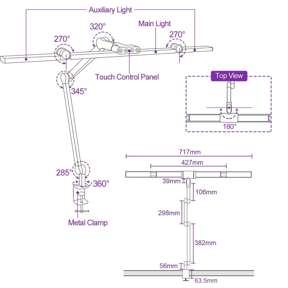 Schattenfreies, verstellbares LED-Licht - Sechs bewegliche Gelenke für perfekte Positionierung - Unabhängiges Schalten der Seitenleisten - Helligkeits- und Farbtemperaturregelung in fünf Stufen - Hochwertige Materialien: Metallkonstruktion - Einfache und sichere Schraubklemmbefestigung an der Tischplatte - Elegantes Design - Diskreter Stromanschluss - Universelle Befestigung - an Tischplatte oder Regal - Leicht zugängliche Touch-Tasten