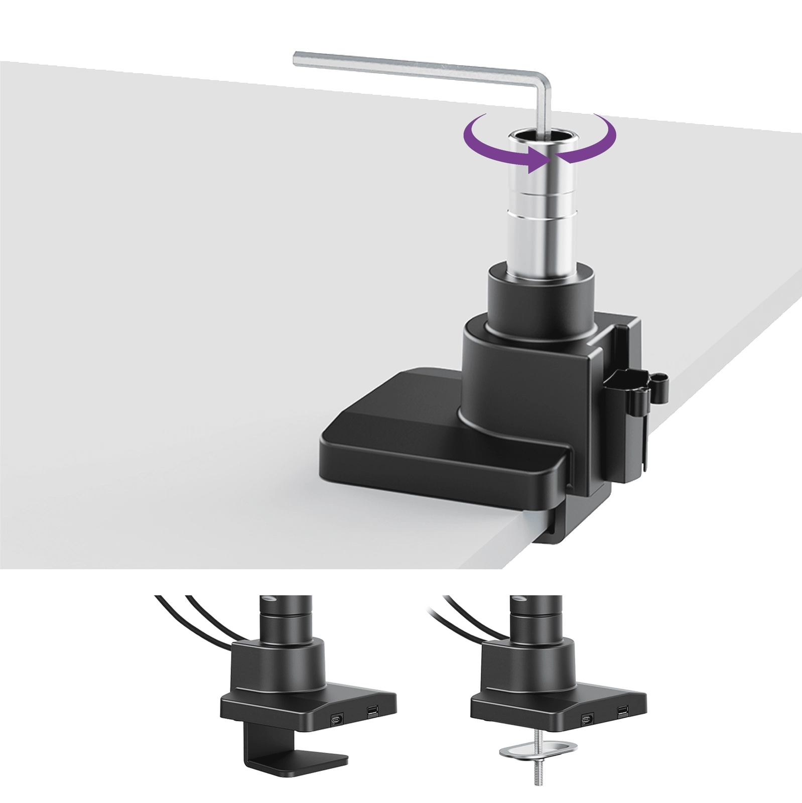 Die Montage einer Monitorhalterung an Ihrem Schreibtisch ist nicht kompliziert. Sie können selbst entscheiden, ob Sie ihn lieber mit einer Tülle oder einer Klemme an der Tischplatte befestigen möchten. In beiden Fällen müssen Sie sich nicht unter den Schreibtisch knien und sich über ungünstig platzierte Schrauben ärgern. Sie befestigen den Arm bequem und schnell von oben auf dem Schreibtisch. Dazu benötigen Sie keine besonderen Kenntnisse oder Werkzeuge.
