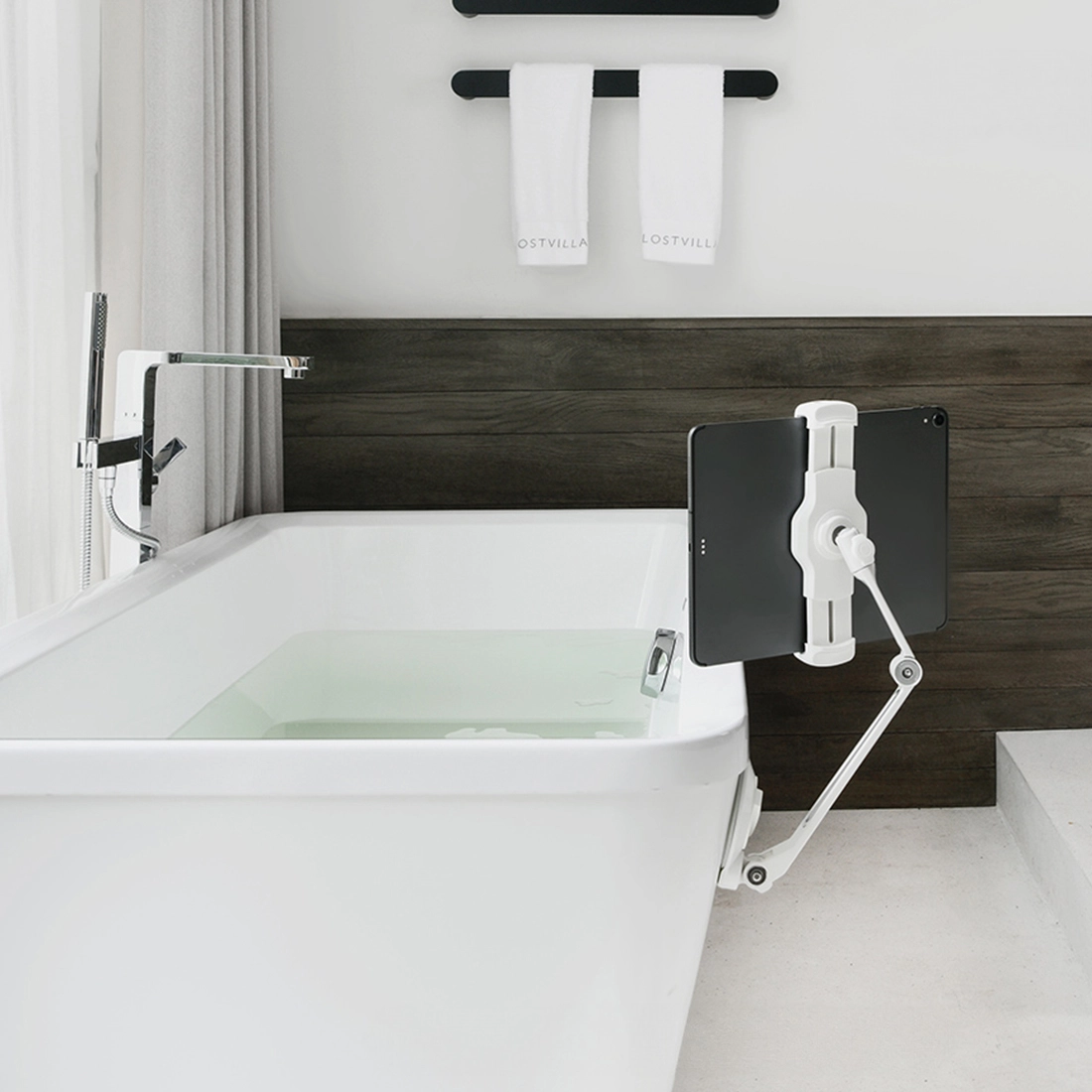 Zamontuj uchwyt na kafelkach, szkle, blacie kuchennym, ścianie czy nawet w warsztacie. Idealny do przeglądania przepisów, oglądania filmów w wannie, rozmów wideo czy pracy biurowej. Możliwość montażu w łazience, kuchni i nie tylko to jego największy atut.