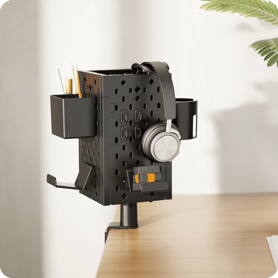 Zusätzlich zu den 4 modularen perforierten Teilen enthält das Set Schreibwarenhalter, Becherhalter, Blockhalter, zwei Arten von Kopfhörerhaltern und Kabelhalter. Es handelt sich um einen kompletten Schreibtischhalter, mit dem Sie Ihr Schreibtischzubehör leicht organisieren können. Sie können selbst entscheiden, wo Sie die einzelnen Halterungen anbringen und wie Sie sie verwenden möchten.