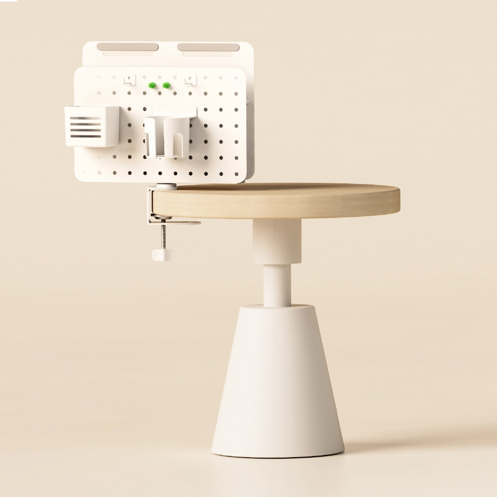 zaciskowe mocowanie tablicy, montaż bez wiercenia, organizer na biurko, uchwyt zaciskowy, biurowy organizer obrotowy, pegboard Spacetronik Holdee, tablica perforowana, ergonomiczne biurko z tablicą