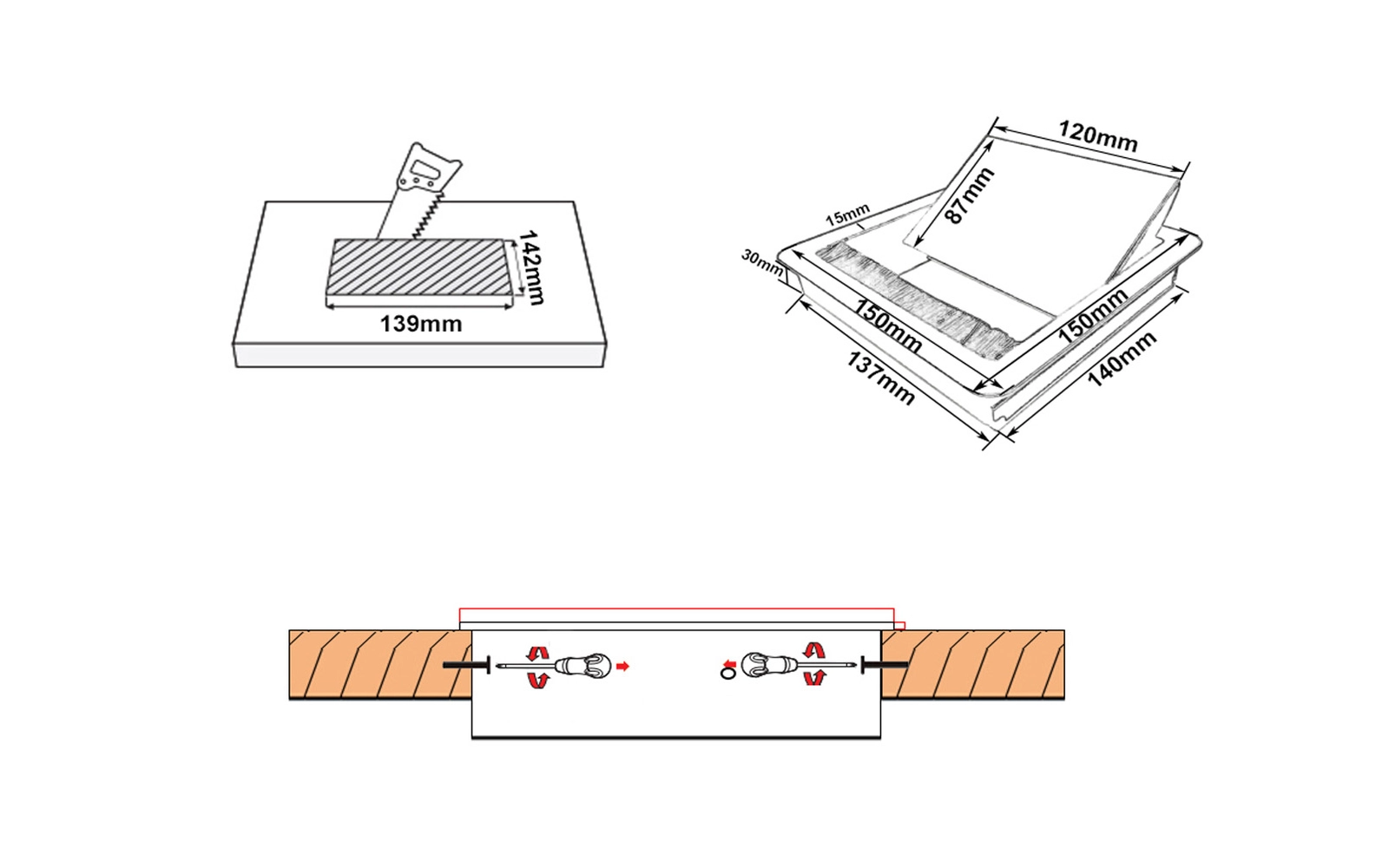 - Innenmaße: 138 mm x 135 mm - Außenmaße: 150 mm x 150 mm - Vorgeschlagene Öffnungsgröße: 140 mm x 137 mm - Höhe der Tülle: 27 mm - Farbe: schwarz - Material: Aluminium, synthetische Borsten