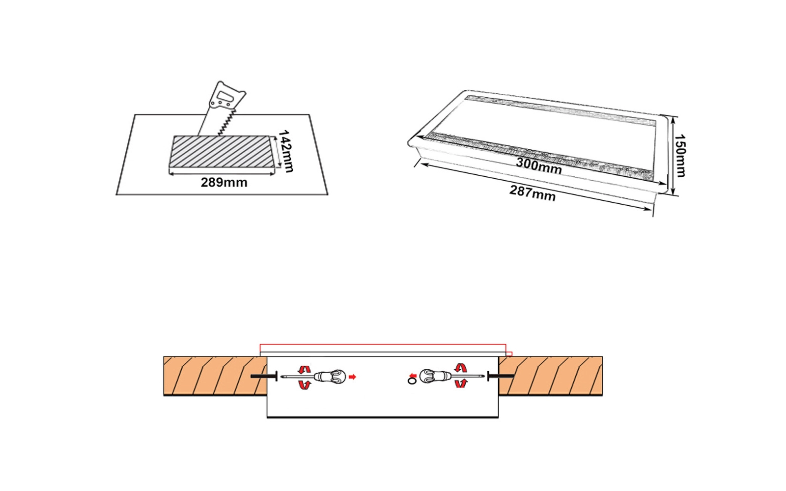- Innenmaße: 138 mm x 285 mm - Außenmaße: 30x15 cm - Vorgeschlagene Öffnungsgröße: 140 mm x 287 mm - Höhe der Tülle: 27 mm - Farbe: schwarz - Material: Aluminium, synthetische Borsten