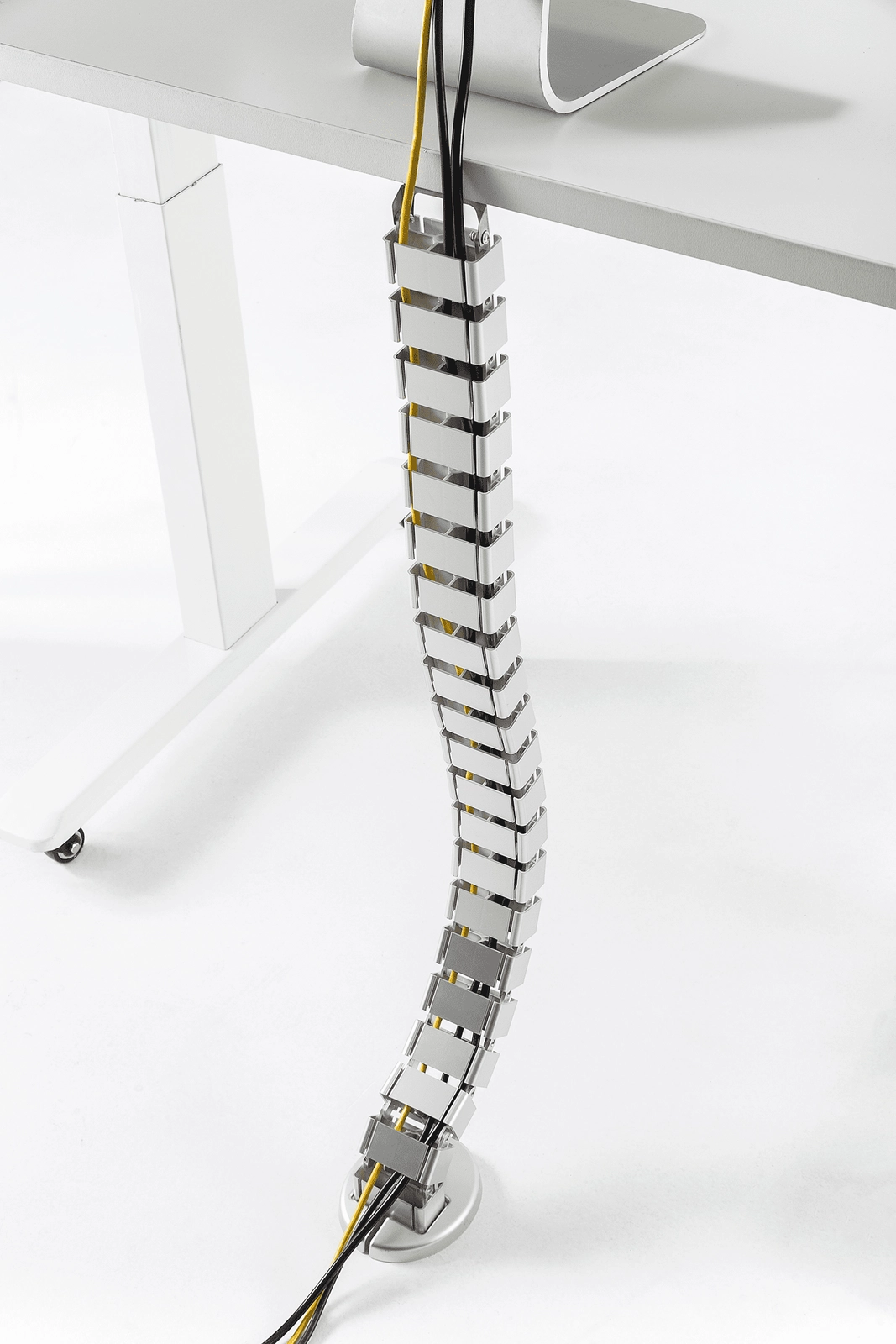 Die Kabelorganisation SPK-180 ist biegbar. Er passt sich an verschiedene Schreibtischhöhen an. Auch an Schreibtische mit Höhenverstellung. Sie müssen ihn nur mit Schrauben am Schreibtisch befestigen. Der Organizer passt sich in der Höhe selbst an, indem er sich biegt oder streckt. Er ist daher ideal für die Verwendung mit elektrischen Schreibtischen.