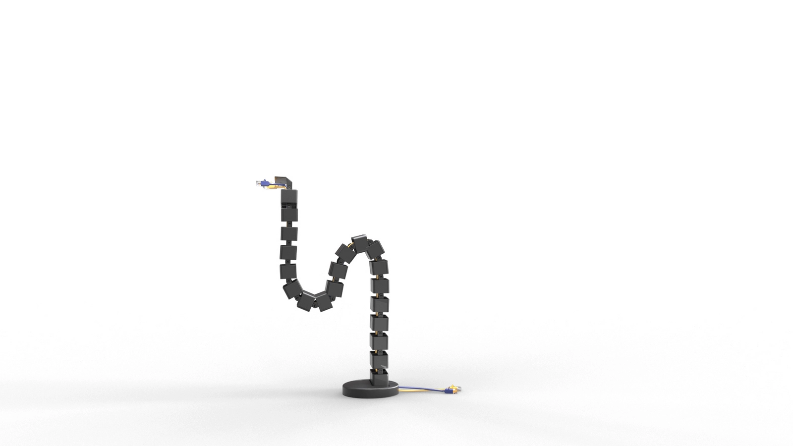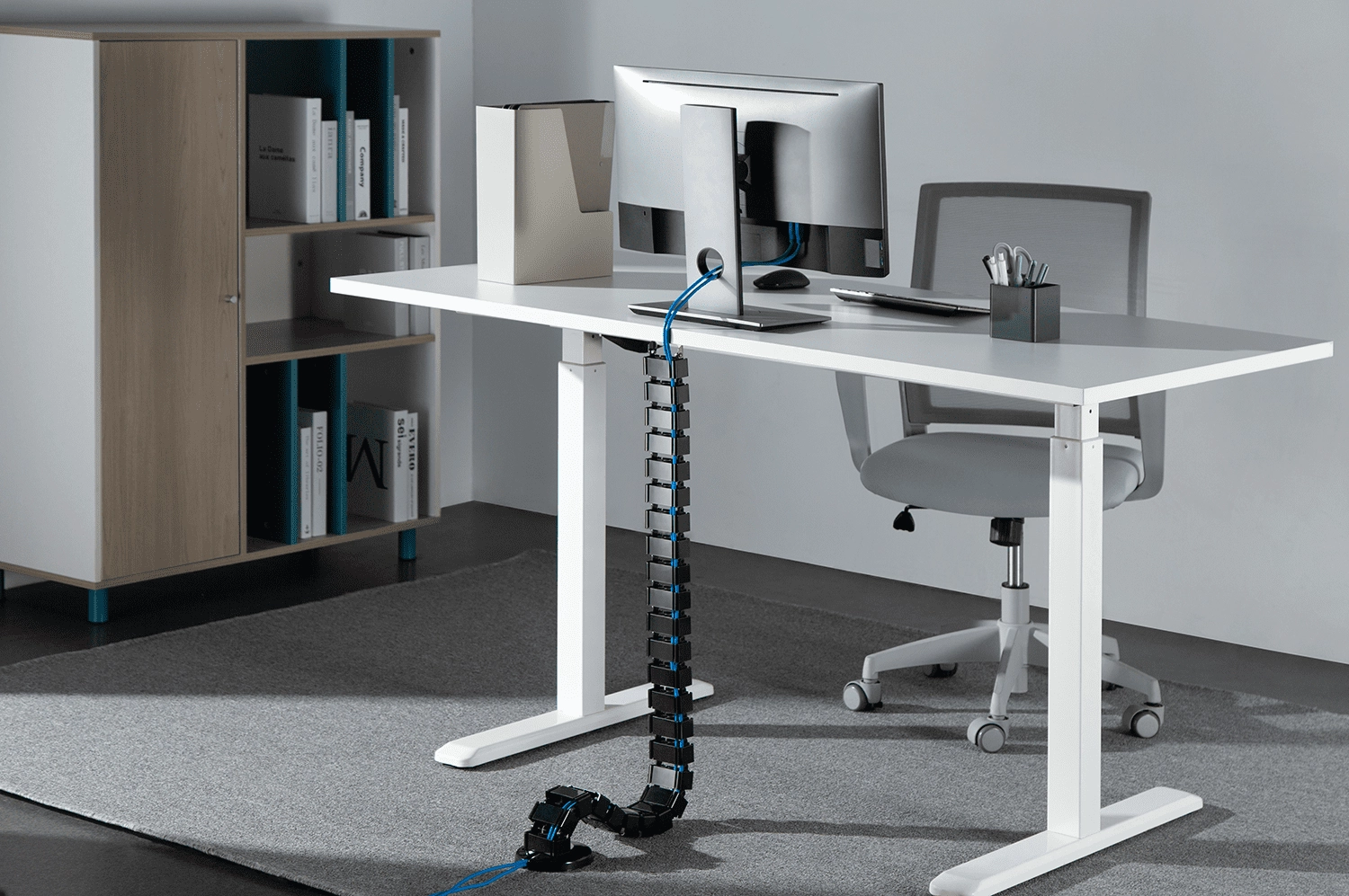 Die Kabelorganisation SPK-188 ist biegbar. Er passt sich an verschiedene Schreibtischhöhen an. Auch an Schreibtische mit Höhenverstellung. Sie müssen ihn nur mit Schrauben am Schreibtisch befestigen. Der Organizer passt sich von selbst der Höhe an, indem er sich biegt oder streckt. Er ist daher ideal für die Verwendung mit elektrischen Schreibtischen.