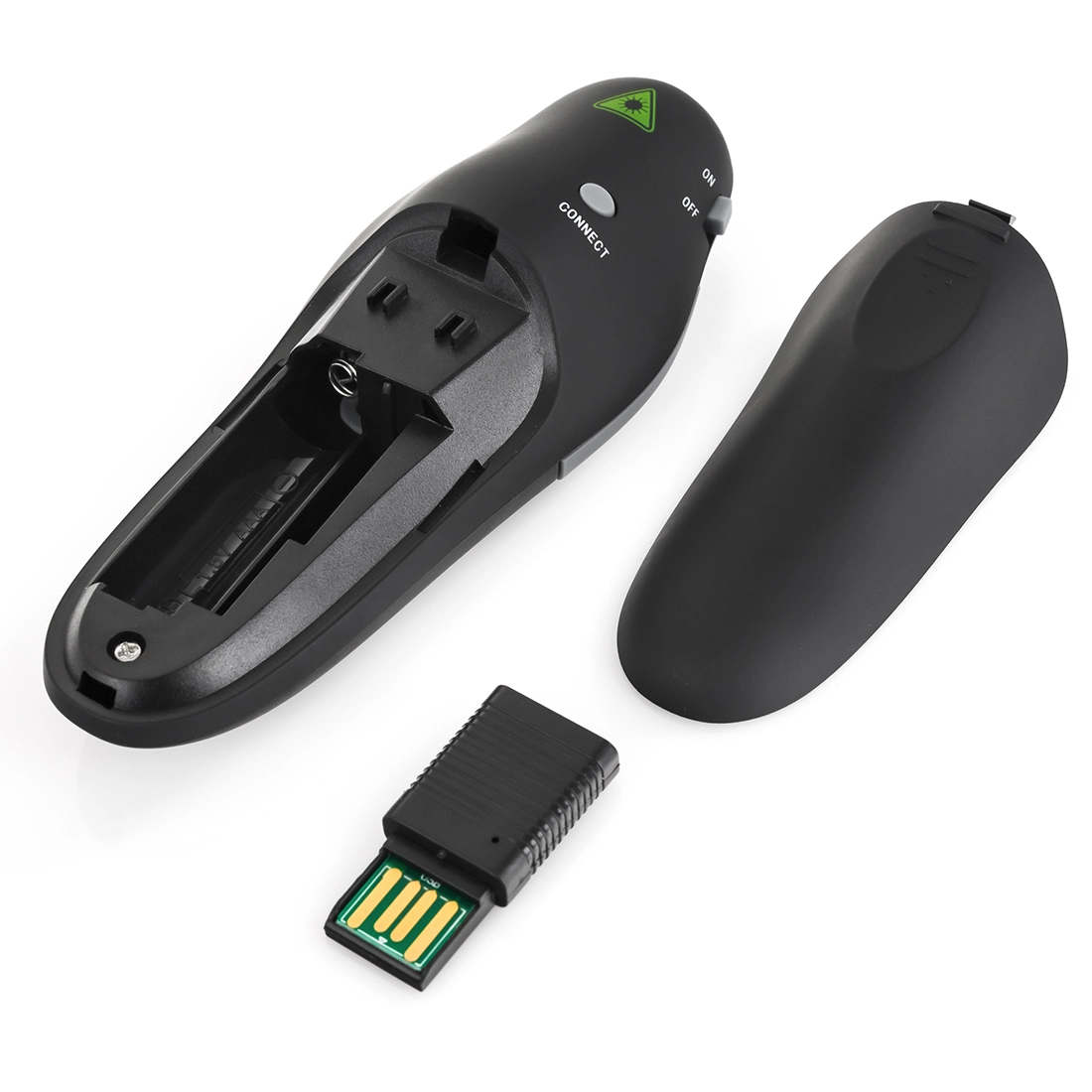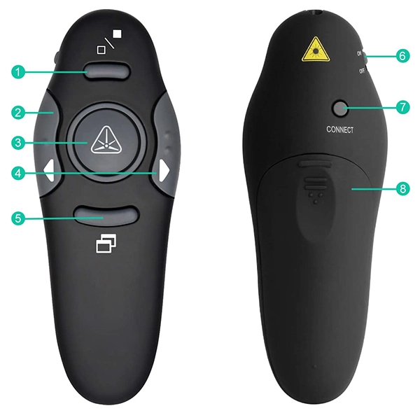 Der im Lieferumfang der Fernbedienung enthaltene Empfänger arbeitet mit einer Frequenz von 2,4 GHz. Das Gerät funktioniert auf Plug & Play-Basis und es müssen keine zusätzlichen Treiber installiert werden. Drücken Sie einfach die Verbindungstaste auf der Rückseite des Gehäuses, um die Verbindung herzustellen. Das Display ist kompatibel mit Windows 2003, XP, Vista, 7, 8, 10, Mac OS, Linux und unterstützt Programme wie Keynote, Google Slides, MS Word, Excel, PowerPoint, Website, PDF