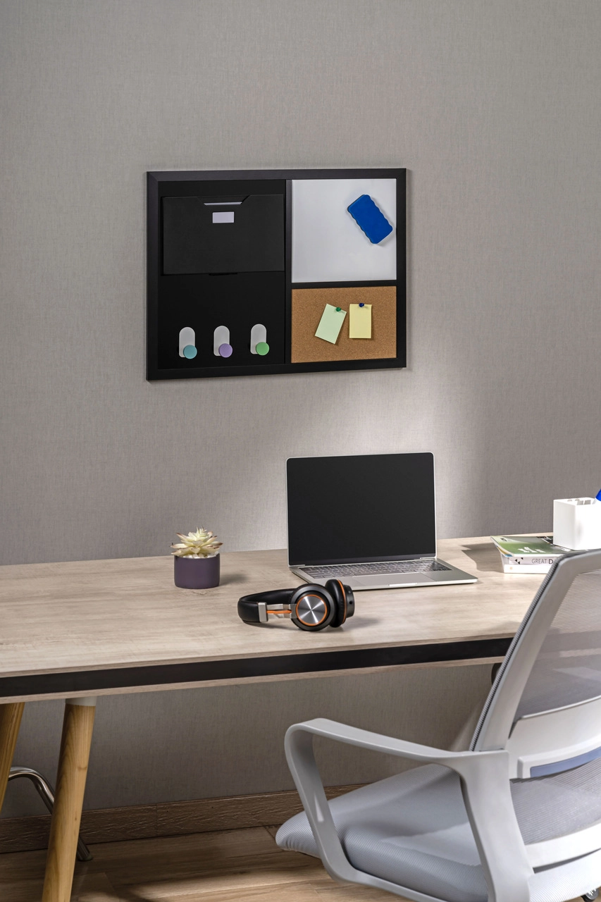 Mit seiner cleveren Kombination aus Trockenlösch-, Kork- und Ablagefunktionen wird dieses Whiteboard zu einem umfassenden Organisationsmittel. Auf der trocken abwischbaren Oberfläche können Sie Ideen auf einen Blick notieren und ausradieren, während Sie auf der Korkfläche Notizen, Karten und wichtige Dokumente anheften können, was die Effizienz Ihrer täglichen Arbeit weiter steigert. Dank des praktischen Stauraums auf dem Whiteboard haben Sie außerdem das nötige Zubehör immer griffbereit, was sich in einem straffen Tagesablauf niederschlägt. Auf diese Weise erfüllt ein einziges Whiteboard drei wichtige Funktionen und schafft einen organisierten und inspirierenden Arbeits- oder Lernort.