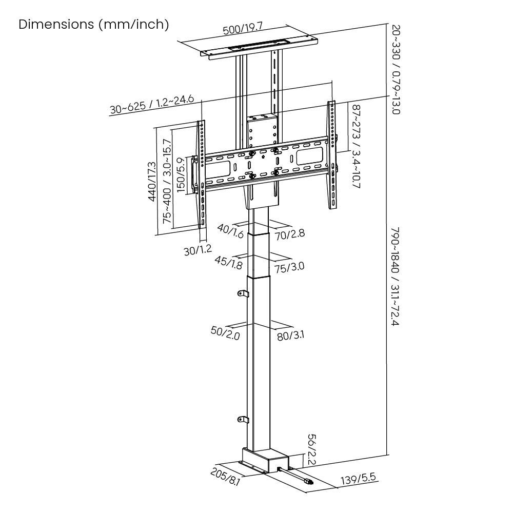 Blechstärke: Bügelarm THK=2 mm kaltgewalztes Blech, VESA-Panel THK=2 mm kaltgewalztes Blech (Bügelarm THK=0,079" kaltgewalztes Blech, VESA-Panel THK=0,079" kaltgewalztes Blech)