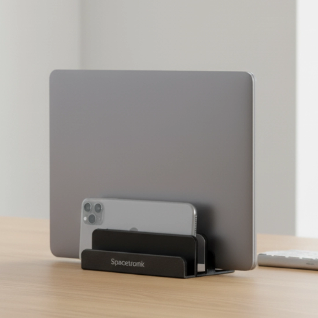 Egal ob Sie einen dicken Laptop oder einen schlanken Mac haben, der Ständer von Spacetronik hat eine verstellbare Griffbreite von 2 bis 4,5 cm. Darüber hinaus gibt es 2 Fächer für Mobiltelefone (jedes Modell passt)