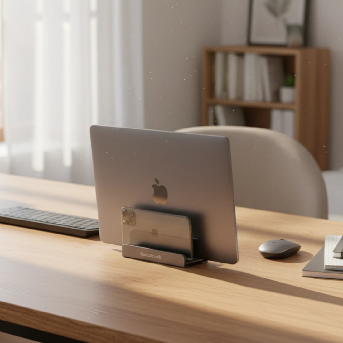 .Der Ständer wurde so konzipiert, dass Sie Ihren Laptop und 2 Telefone an einem Ort. Sie können es einfach auf einen Schreibtisch, ein Regal oder einen anderen speziellen Ort. Im Gegensatz dazu bewahren Sie an diesem Stand die Dinge in einem vertikal, um weniger Platz zu beanspruchen.