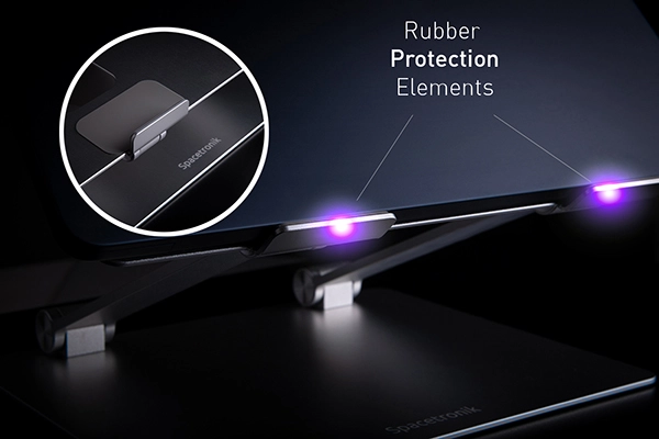 Der Ständer ist an den kritischen Stellen mit gummierten Pads ausgestattet. Dadurch wird nicht nur der Schreibtisch, sondern auch das Gerät selbst vor Kratzern geschützt.