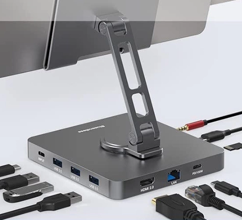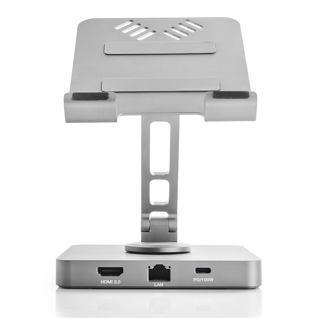 Der Laptop-Ständer mit USB-C, USB, HDMI, Kartenleser, Rj45 und AUX ist ein praktisches Zubehör, mit dem Sie Ihr Tablet bequemer und funktioneller nutzen können. Es ist eine Art Dockingstation oder Ständer, der auf einem Schreibtisch, Tisch oder überall dort platziert werden kann, wo Sie seine Konnektivität mit verschiedenen Geräten erweitern möchten.