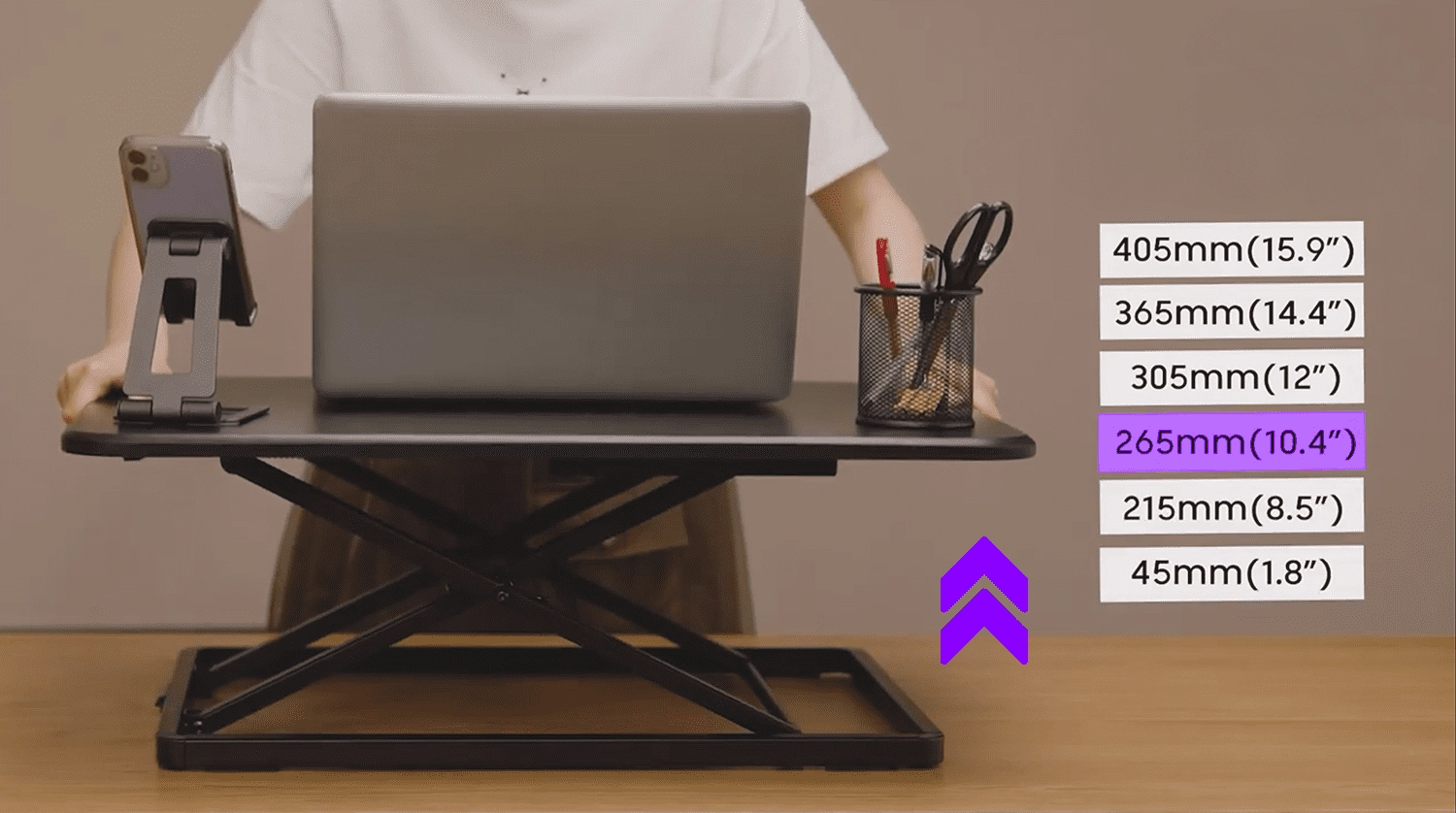 Der SPR-212MB Laptopständer bietet 6 Höhenstufen. So können Sie ihn perfekt auf Ihre Bedürfnisse einstellen. So können Sie sich zurücklehnen und Ihre Lieblingsserie mit abgesenktem Ständer ansehen. Heben Sie ihn einfach an, wenn Sie fertig sind. So können Sie in aller Ruhe im Stehen an Ihrem College-Aufsatz arbeiten. Genießen Sie alle Vorteile der Sit-Stand-Arbeit.