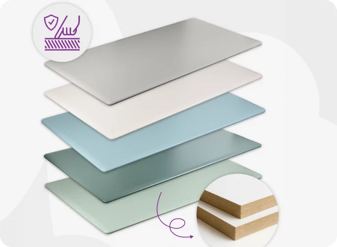 Niezwykła odporność na zarysowania: Zapomnij o nieestetycznych śladach użytkowania. Nasze powlekane proszkowo blaty MDF cechuje najwyższa klasa pokrycia, która sprawia, że są one wyjątkowo odporne na codzienne uszkodzenia mechaniczne. Twój blat zachowa perfekcyjny wygląd przez długie lata, nawet w intensywnie użytkowanym biurze.