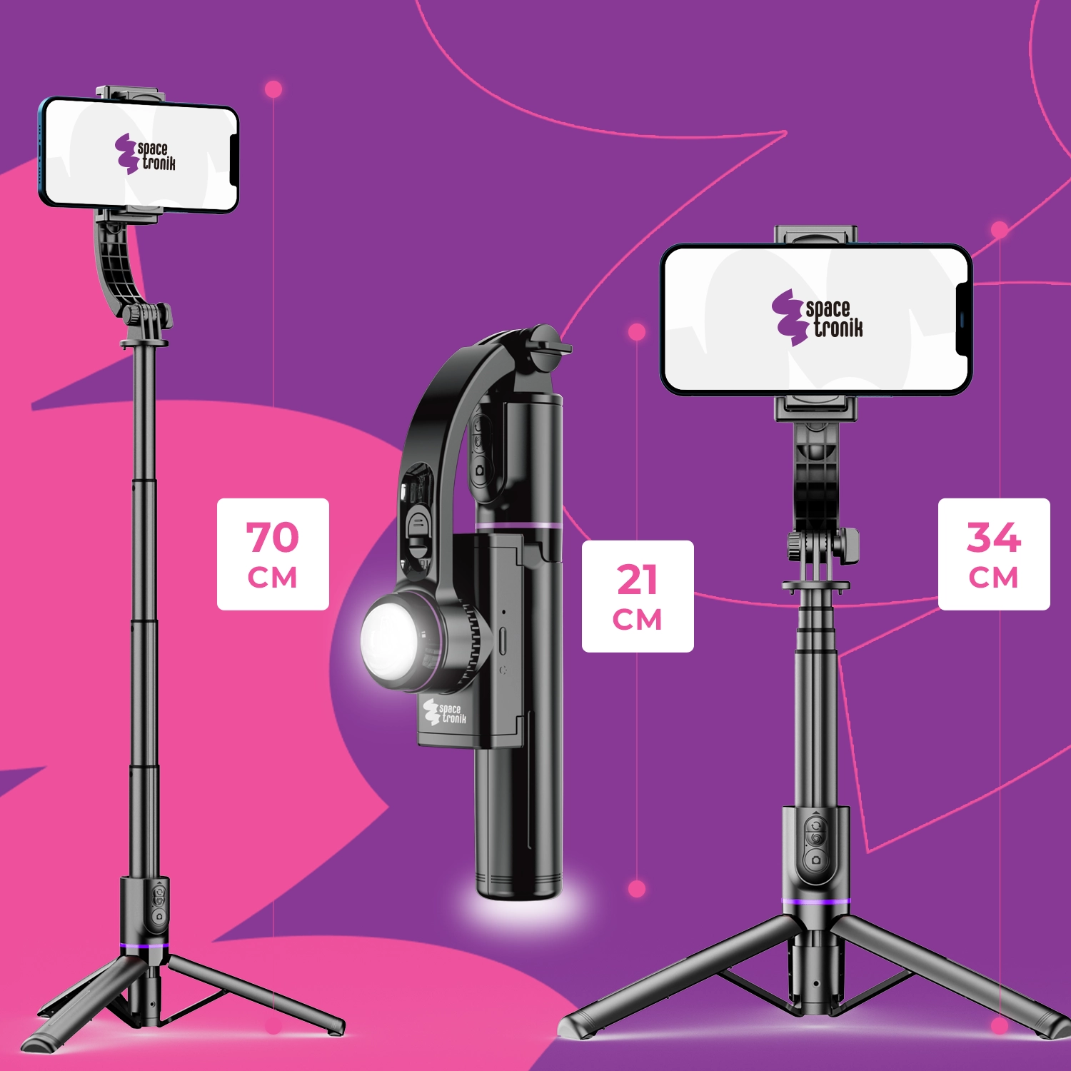 Spacetronik SR-ROLLPIX01 Selfie Stick z Statywem, stabilizatorem gimbalowym i światłem doświetlającym