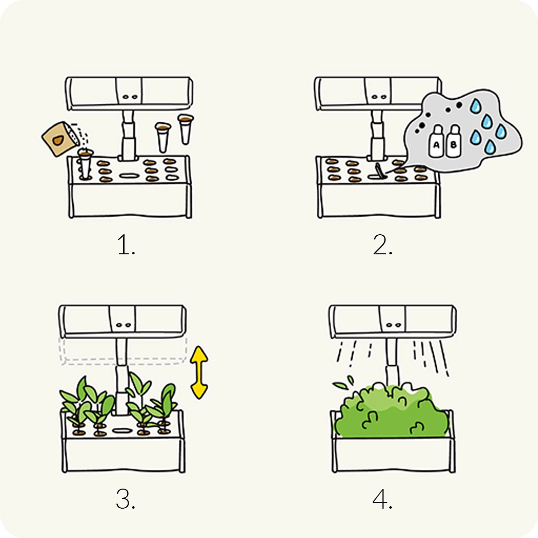 - Wyposażenie: 4 wymienne tacki na nasionka (10 otworów x2, 6 otworów x2), , 40 różnego typu pojemników na nasionka (po 20 każdego typu), A & B suplementy, zasilacz.
