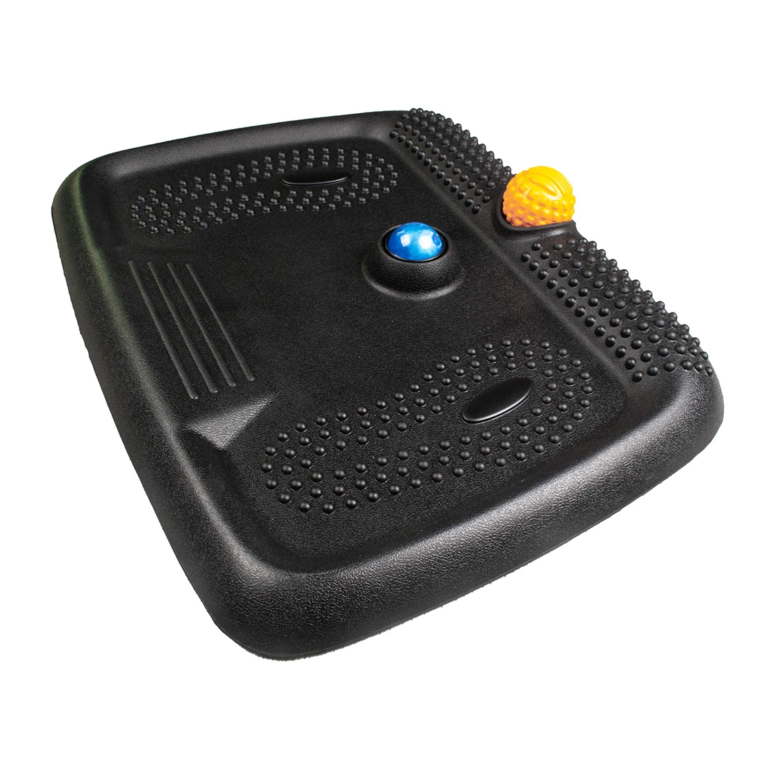 W zestawie znajdują się dwie zintegrowane fabrycznie z matą piłki masujące - żółta (do uciskania) i niebieska (do toczenia) - które można kulać pod stopami w trakcie stania. Każda z nich ma inną twardość, dzięki czemu dopasujesz intensywność masażu do własnych potrzeb. Ruch stopy po wypukłościach i kulkach rozluźniają powięź i ścięgna stóp, zapobiegają zastojom krwi w łydkach i pozwalają zapobiegać uczuciu „drętwych nóg”. To prosta forma odprężenia, która poprawia komfort i wspomaga regenerację mięśni uaktywniając mięśnie stabilizujące.