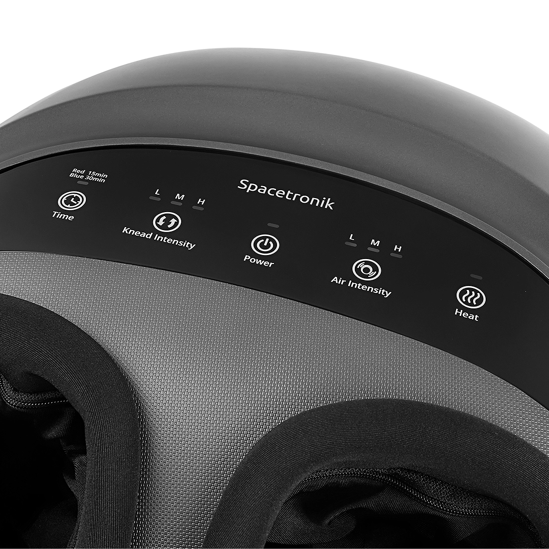 Masażer stóp Spacetronik SPE-M02 został wyposażony w łatwy w użyciu panel sterowania, który można obsługiwać za pomocą palca u nogi, bez konieczności schylania się. Posiada 3 regulowane poziomy intensywności masażu, 3 regulowane poziomy intensywności masażu kompresyjnego 3D, funkcję podgrzewania i ustawienie czasu masażu 15 lub 30 minut. O aktualnej konfiguracji ustawień informują diody nad przyciskami.