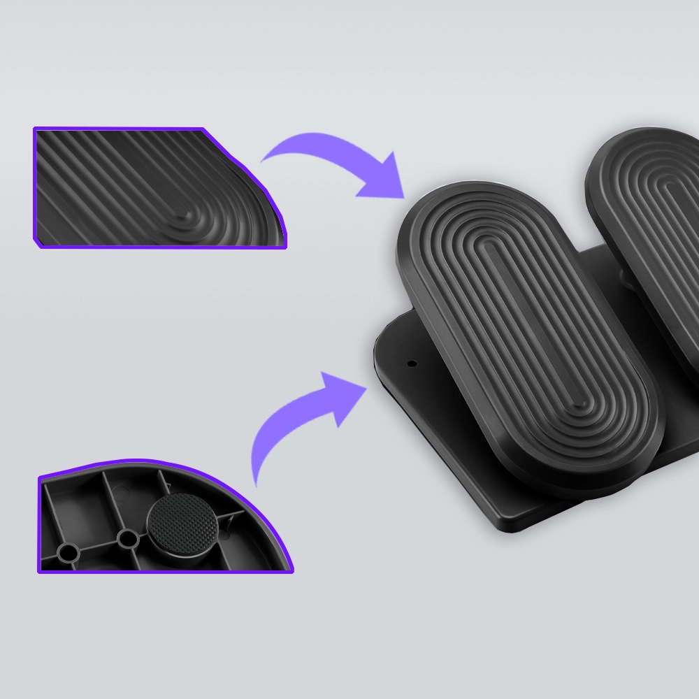 Podstawka pod stopy SPE-M08B została wykonana z połączenia stali w kolorze czarnym i solidnego ciemnego plastiku. Podnóżek został wyposażony w dwa pedały, na które możesz naciskać oddzielnie od siebie. Ich powierzchnia została odpowiednio wyrzeźbiona, żeby stymulować organizm i jeszcze skuteczniej Cię relaksować. Dodatkowo podstawa urządzenia jest wyposażona w antypoślizgowe podkładki, które zabezpieczą Twój mini stepper przed przemieszczaniem się w trakcie ćwiczeń. Kolejnym atutem takiego rozwiązania jest, fakt, że podkładki antypoślizgowe zapobiegną zarysowaniu powierzchni, na której znajduje się podnóżek.