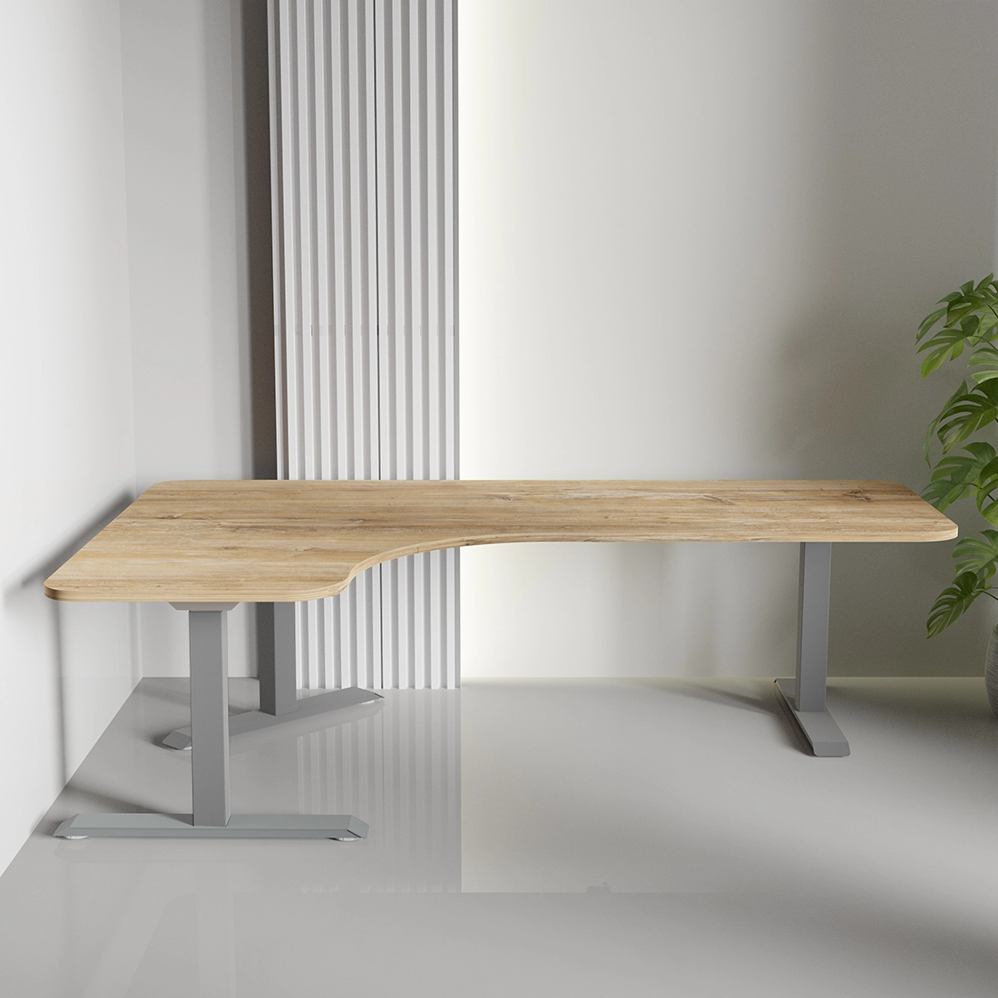 Solidny uniwersalny blat  do biurka lub stołu wykonany z wysokiej jakości płyty obustronnie laminowanej o grubości 18 mm. Posiada zaokrąglone narożniki i jest zabezpieczony obrzeżami z ABS. W połączeniu z elektrycznym stelażem biurkowym stanowi ergonomiczne i nowoczesne wyposażenie miejsca pracy, zarówno w domu, jak i przestrzeni biurowej. Kształt blatu L, przeznaczony do stelaży narożnych.