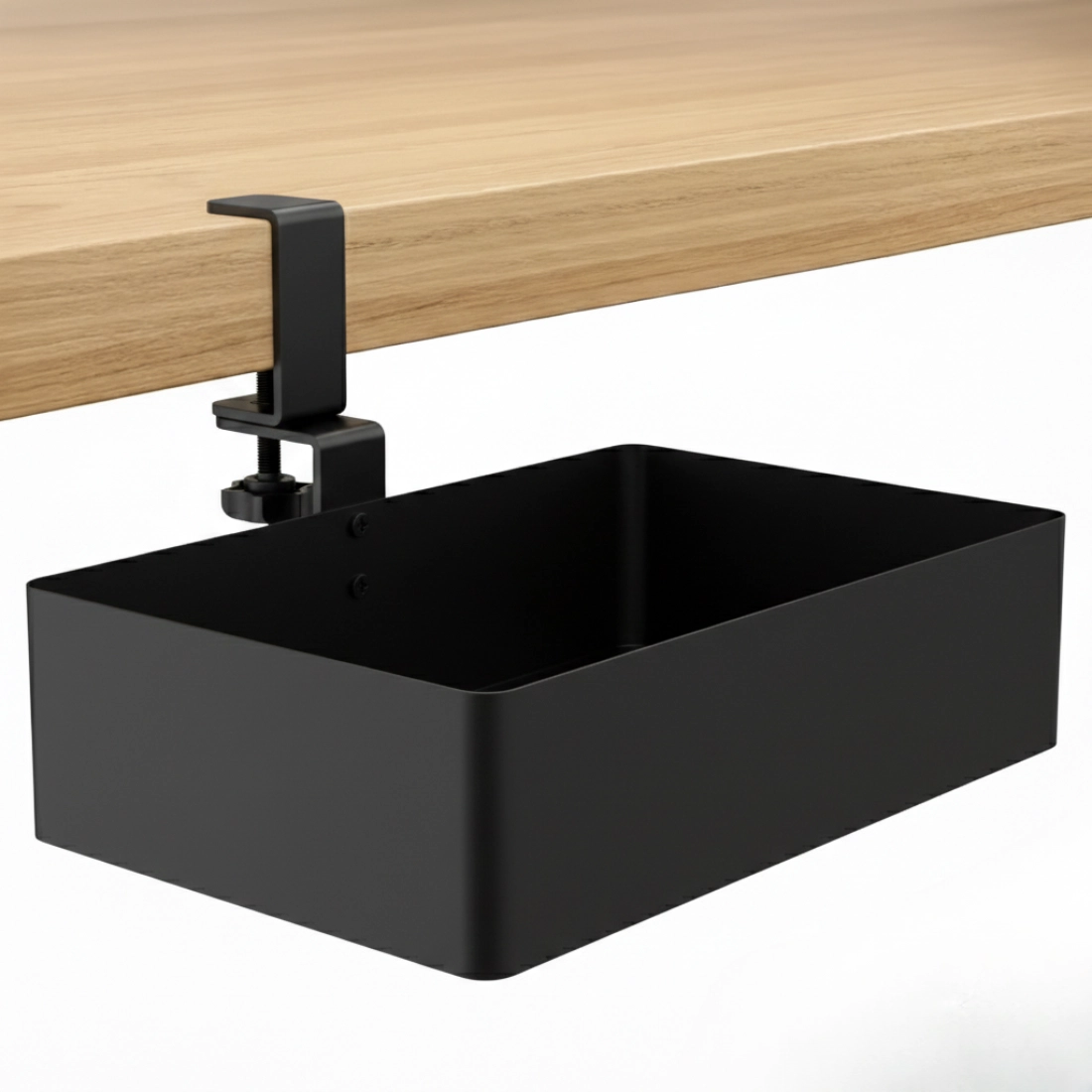 SPB148B to boczny organizer do biurka montowany na zacisk (clamp), który pomaga uporządkować stanowisko bez wiercenia i bez stałego montażu. Stalowa konstrukcja w czarnym wykończeniu jest trwała i stabilna, a rozmiar 25 × 17 × 15 cm pozwala wygospodarować dodatkowe miejsce na laptopa, książki lub dokumenty obok blatu. To prosty sposób, aby zwolnić przestrzeń roboczą i trzymać najpotrzebniejsze rzeczy w zasięgu ręki.