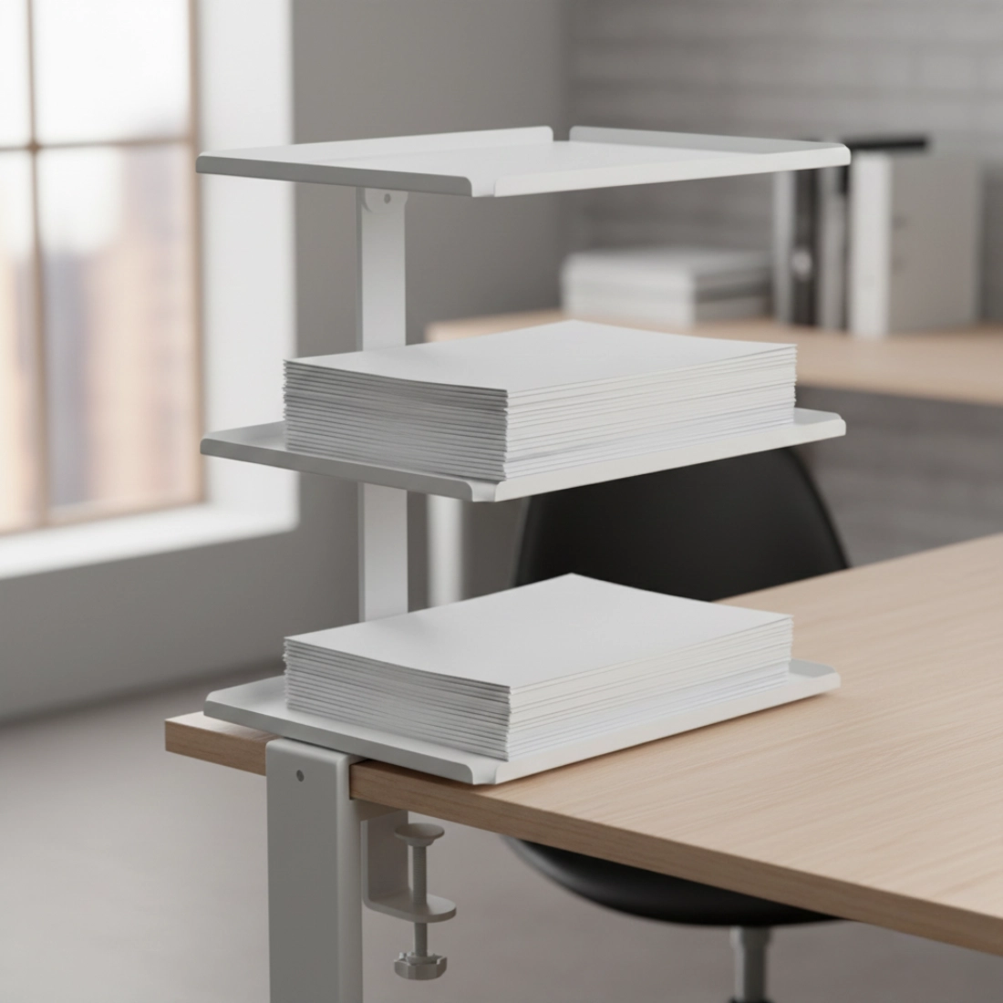 SPB147W to rozbudowany boczny organizer do biurka montowany na zacisk (clamp), wyposażony w półki do przechowywania i możliwość zmiany kierunku instalacji. Stalowa konstrukcja zapewnia stabilność, a białe wykończenie pasuje do jasnych, nowoczesnych stanowisk pracy. Wymiary 28 × 17,5 × 45 cm pomagają uporządkować akcesoria, dokumenty i książki, przenosząc je z blatu na praktyczny moduł boczny – bez wiercenia i bez stałego montażu.