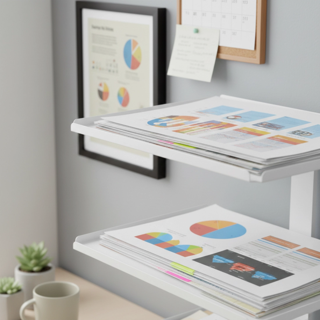 Przenieś książki, dokumenty i akcesoria na boczne półki, aby zwolnić przestrzeń na blacie. To prosty sposób na lepszą organizację pracy i szybki dostęp do potrzebnych rzeczy.