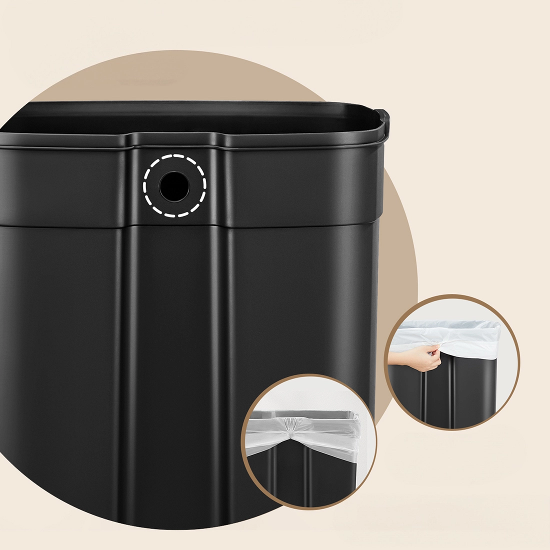 Dzięki specjalnemu systemowi mocowania, wewnętrzne wiadro pozwala na dyskretne schowanie worka na śmieci, eliminując problem nieestetycznego zwisania jego brzegów. Worek jest idealnie dopasowany i zabezpieczony, co nie tylko poprawia wygląd kosza, ale również zwiększa komfort użytkowania. To rozwiązanie, które łączy estetykę z funkcjonalnością – doskonałe do nowoczesnych wnętrz, gdzie każdy detal ma znaczenie.