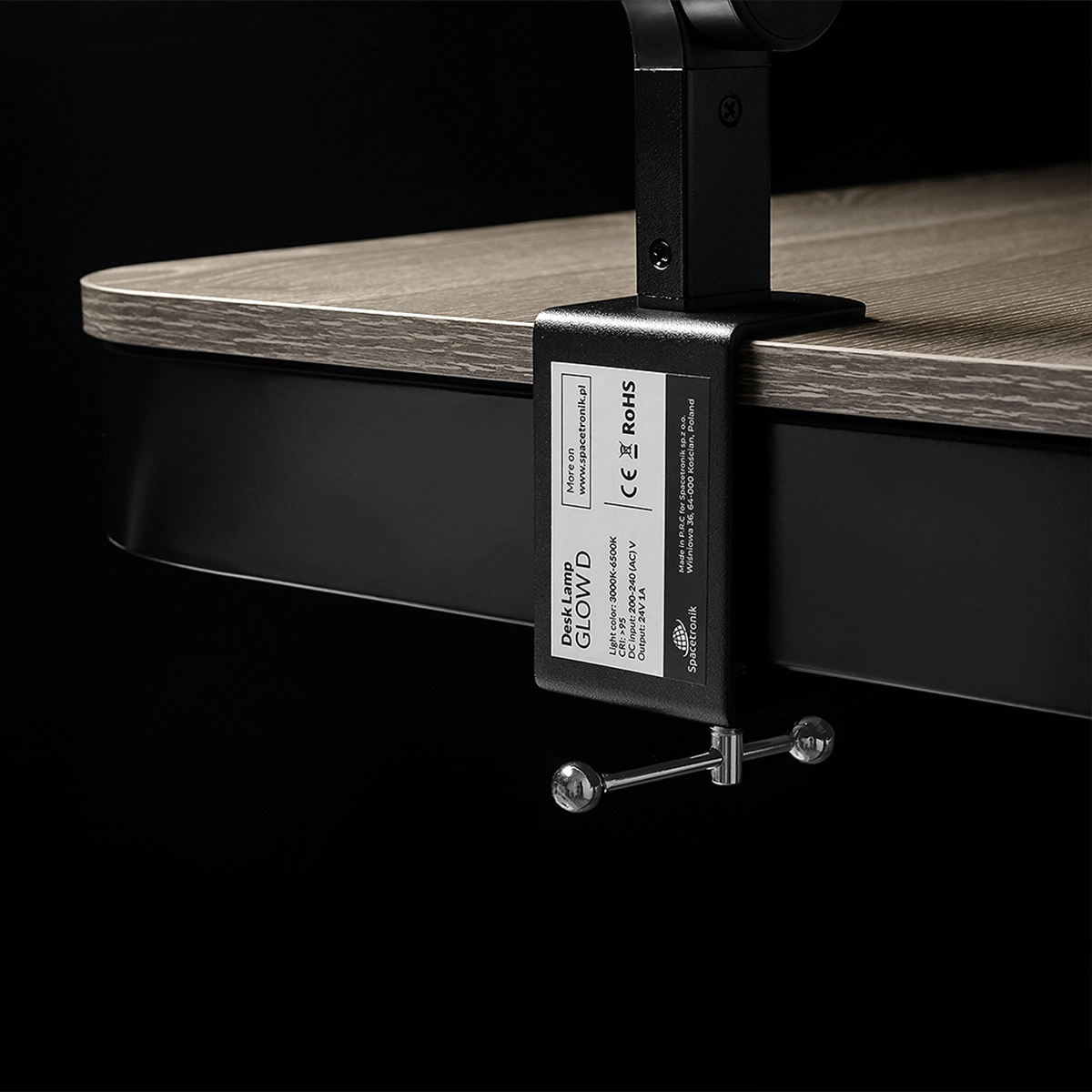 Nie musisz być ekspertem, aby zamontować lampę Spacetronik Glow na swoim biurku. Dzięki prostemu systemowi mocowania na zacisk śrubowy, instalacja jest szybka i bezproblemowa. Wystarczy przymocować lampę do krawędzi blatu o grubości do 63 mm, a solidna metalowa śruba zapewni stabilność całej konstrukcji. Dodatkowe gumowe podkładki chronią powierzchnię biurka przed zarysowaniami, więc nie musisz martwić się o uszkodzenia mebli. To praktyczne rozwiązanie pozwala na pewne zamocowanie lampy niemal na każdej płaskiej powierzchni, dając Ci pełną swobodę w aranżacji przestrzeni pracy.