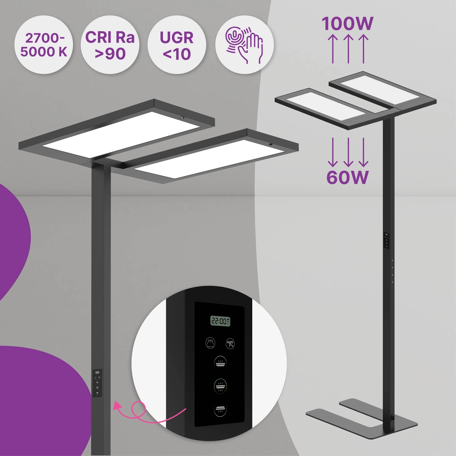 Spacetronik GLOW D24 to nowoczesna lampa podłogowa LED stworzona z myślą o wymagających przestrzeniach biurowych, co-workingach i gabinetach. Ten model zapewnia wyjątkową moc świetlną 160 W (100 W↑ / 60 W↓), z regulowaną temperaturą barwową w zakresie od 2700 K do 5000 K, pozwalającą dostosować światło do indywidualnych potrzeb; pomagając spełnić wymogi norm. Lampa wyposażona jest w nowoczesny panel dotykowy do regulacji jasności i temperatury światła. Obecne są także dodatkowe funkcje: czujnik ruchu, czujnik dnia oraz HCL (Human Centric Lighting), umożliwiający skorzystać z cyklu światła cyrkadianowego. Wysoka jakość światła CRI Ra > 90 i niski współczynnik olśnienia UGR < 10 zapewniają komfort pracy przy komputerze oraz wzbogacenie efektywności.
