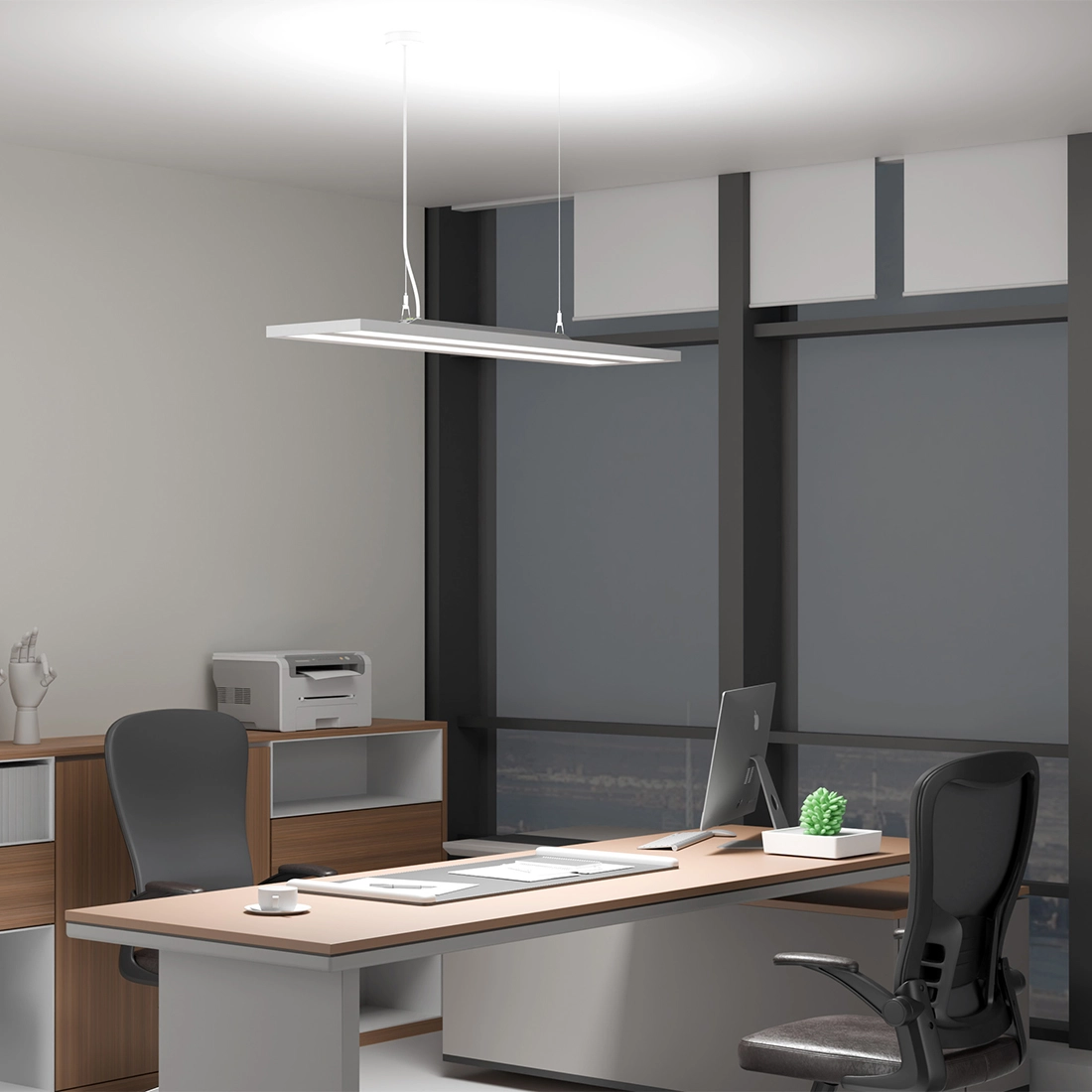 Ergonomiczna lampa wisząca ma wspierać pracę, a nie odciągać uwagę. Korpus 1200 × 280 × 25 mm nie przytłacza wnętrza, a rozsył 110° ku górze i 90° w dół równomiernie wypełnia przestrzeń miękkim światłem. Podział mocy 30 W↑ / 30 W↓ odpowiada temu, jak korzystamy z biurka: strumień kierowany w sufit odbija światło i wygładza kontrasty, a strumień w dół precyzyjnie akcentuje zadania. Zawieszenie na stalowych linkach stabilizuje oprawę i pozwala wygodnie ustawić wysokość nad blatem. To proste narzędzie, które pomaga zbliżyć się do wymogów ergonomii pracy w biurze.