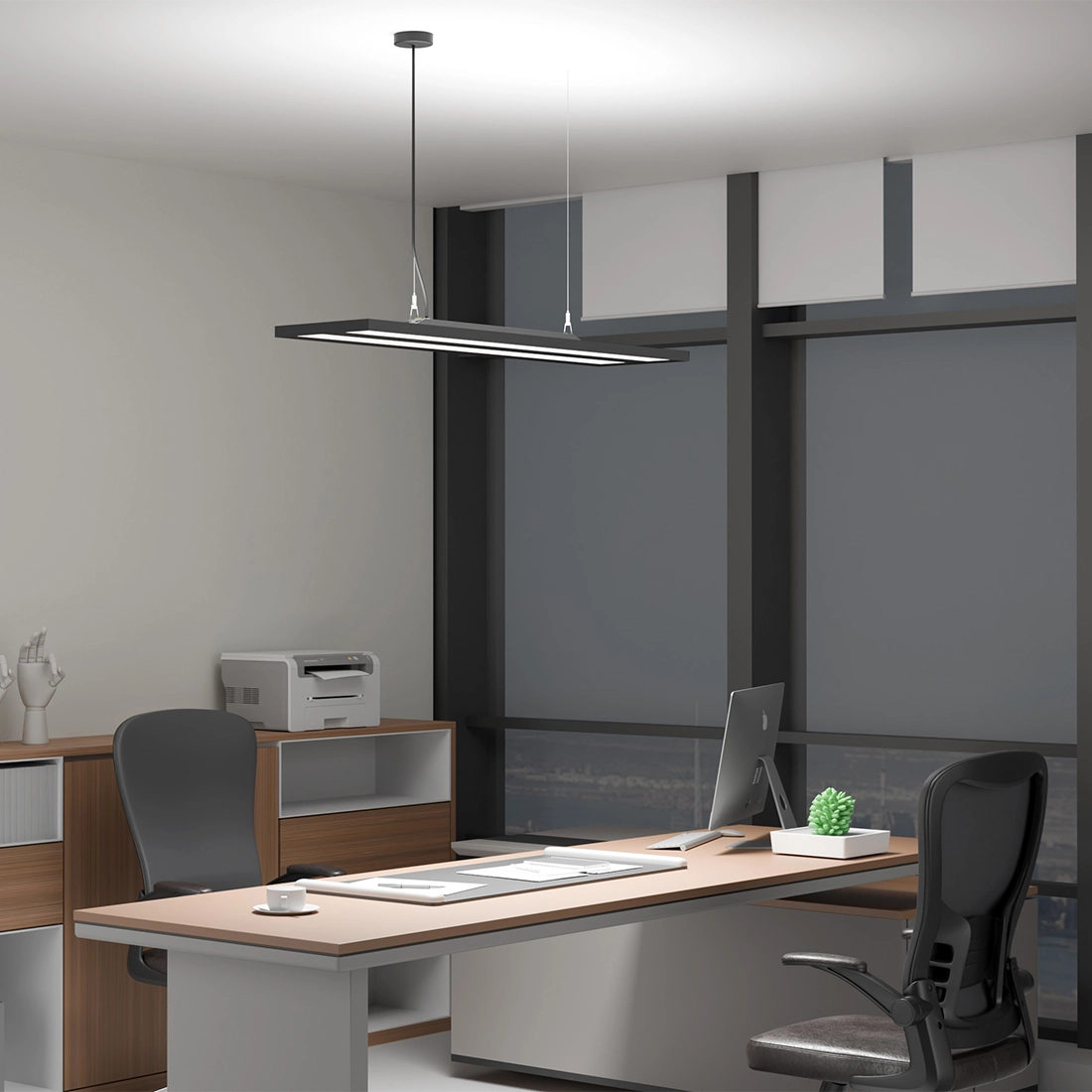Ergonomiczna lampa wisząca ma wspierać pracę, a nie odciągać uwagę. Korpus 1200 × 280 × 25 mm nie przytłacza wnętrza, a rozsył 110° ku górze i 90° w dół równomiernie wypełnia przestrzeń miękkim światłem. Podział mocy 30 W↑ / 30 W↓ odpowiada temu, jak korzystamy z biurka: strumień kierowany w sufit odbija światło i wygładza kontrasty, a strumień w dół precyzyjnie akcentuje zadania. Zawieszenie na stalowych linkach stabilizuje oprawę i pozwala wygodnie ustawić wysokość nad blatem. To proste narzędzie, które pomaga zbliżyć się do wymogów ergonomii pracy w biurze.