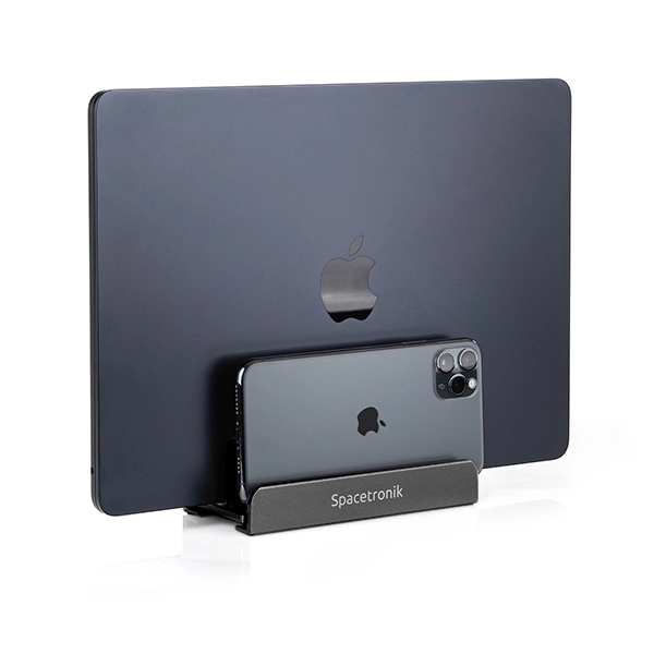 Bez różnicy czy masz grubego laptopa, czy wąskiego Maca, podstawka od Spacetronik posiada regulację szerokości uchwytu od 2 do 4,5 cm. Oprócz tego znajdują się w nim 2 miejsca na telefony komórkowe (każdy model się zmieści)