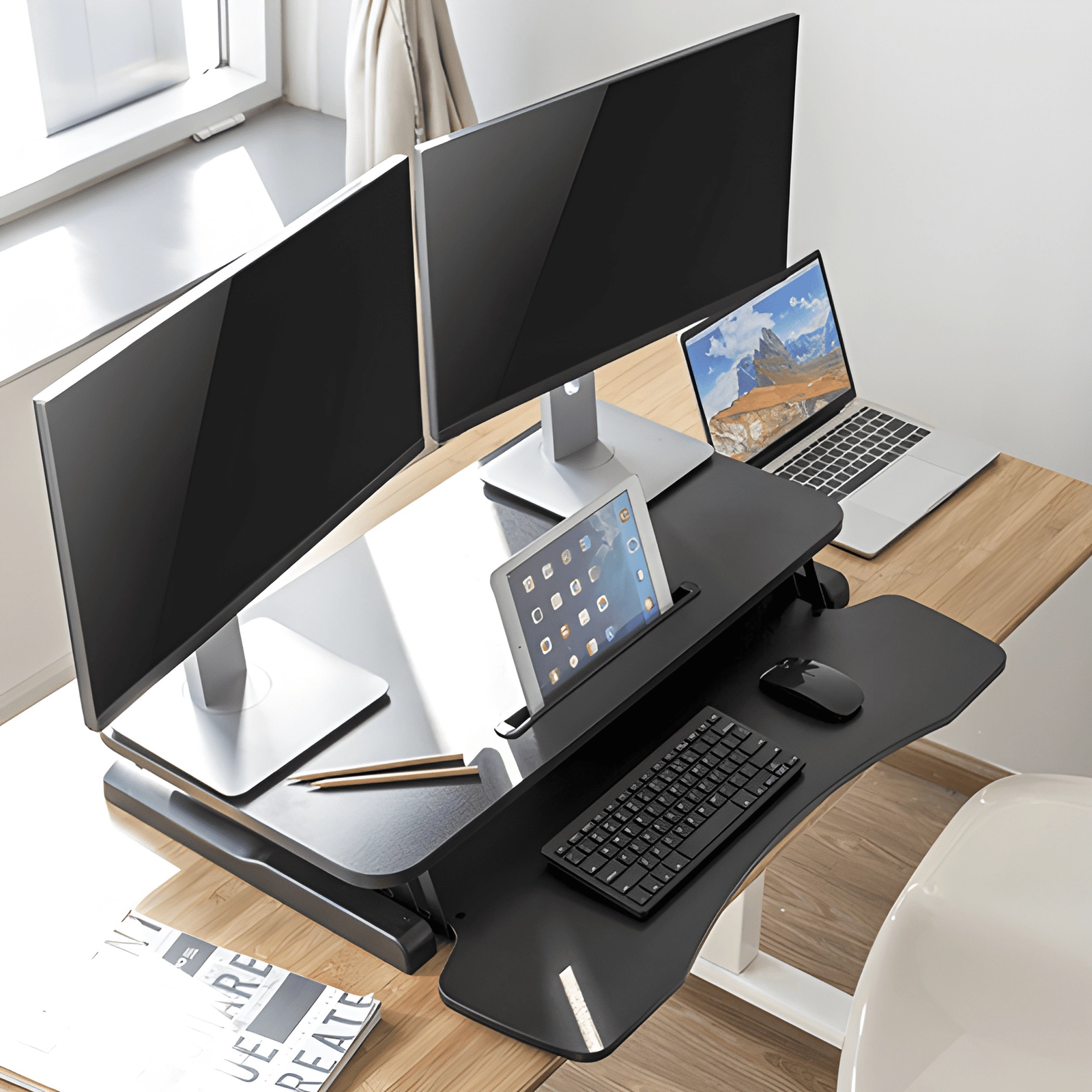 Wygodna praca to nie tylko możliwość zmiany wysokości swojego stanowiska. Ważnym czynnikiem wpływającym na jakość Twojej pracy jest również odpowiednio duża przestrzeń robocza. Regulowana podstawka na biurko została wyposażona w duży blat o wymiarach 800×400 mm. Co więcej, poniżej blatu znajduje się dodatkowa półka np. na klawiaturę o wymiarach 795×300 mm. Dzięki temu zyskasz sporo przestrzeni do wygodnej i wydajnej pracy.