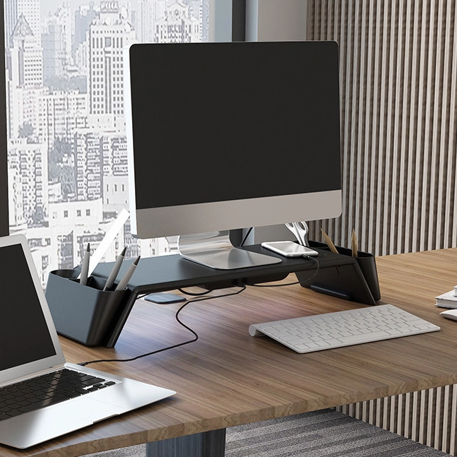 Uwolnij się od napięcia, bólów głowy lub zmęczenia oczu i szyi. Przekształć swoje tradycyjne biurko w ergonomiczne stanowisko pracy. Ta designerska stacja robocza podnosi monitor do komfortowego poziomu widzenia, eliminując niepotrzebne zmęczenie szyi i oczu. Zyskaj większy komfort pracy przy biurku i utrzymaj porządek - przechowuj niezbędne przybory biurowe w bocznych pojemnikach. Składana konstrukcja umożliwia łatwe przechowywanie i transport. Produkt nie wymaga montażu - kup i używaj.