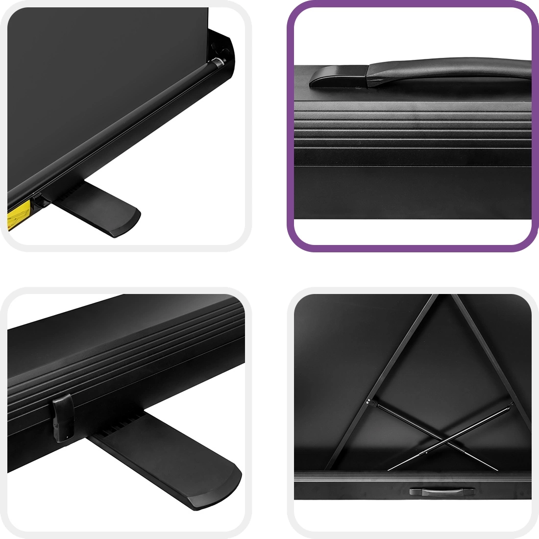 Nasz podłogowy ekran projekcyjny jest niezwykle łatwy do rozstawienia. 10 sekund- tylko tyle zajmuje jego rozłożenie! Dzięki solidnej pokrywie z rączką, można go z łatwością przenosić i ustawiać w dowolnym miejscu. Gazowo nożycowa rama umożliwia szybkie i płynne rozwinięcie ekranu z podłogi, bez potrzeby montażu.