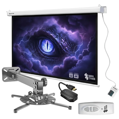 W zestawie otrzymujesz: elektryczny ekran projekcyjny ścienno-sufitowy z materiału PVC EASY VIEW (rozmiar i format obrazu do wyboru), uniwersalny uchwyt sufitowy do projektora Spacetronik SPA-P02B z regulacją wysokości, pochyłu i obrotu oraz bezprzewodowy transmiter HDMI 1080p USB-C Spacetronik SPH-CW32 z zasięgiem do 50 m i obsługą systemów Android, Windows, macOS i iOS.